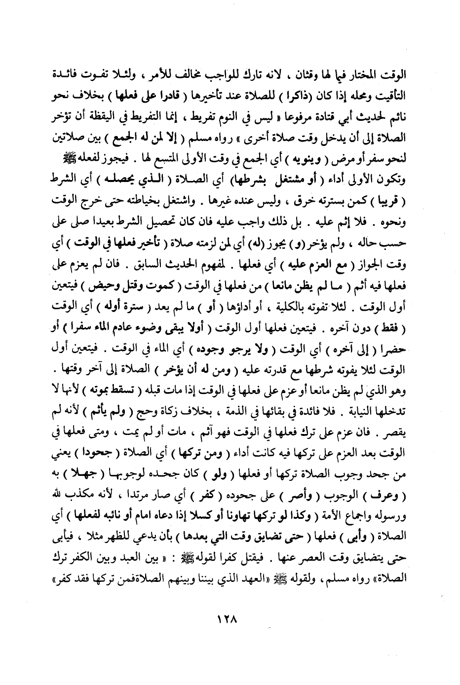 فَيُقْتَلُ كُفْرًا لِقَوْلِهِ صَلَّى اللَّهُ عَلَيْهِ وَسَلَّمَ «: بَيْنَ الْعَبْدِ وَبَيْنَ الْكُفْرِ تَرْكُ الصَّلَاةِ» رَوَاهُ مُسْلِمٌ.
