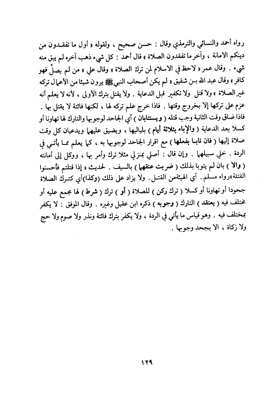 وَقَالَ عُمَرُ " لَا حَظَّ فِي الْإِسْلَامِ لِمَنْ تَرَكَ الصَّلَاةَ " وَقَالَ عَلِيٌّ " مَنْ لَمْ يُصَلِّ فَهُوَ كَافِرٌ " وَقَالَ عَبْدُ اللَّهِ بْنُ شَقِيقٍ " لَمْ يَكُنْ أَصْحَابُ النَّبِيِّ صَلَّى اللَّهُ عَلَيْهِ وَسَلَّمَ يَرَوْنَ شَيْئًا مِنْ الْأَعْمَالِ تَرْكُهُ كُفْرٌ غَيْرَ الصَّلَاةِ " وَلَا قَتْلَ وَلَا تَكْفِيرَ قَبْلَ الدِّعَايَةَ، وَلَا يُقْتَلُ بِتَرْكِ الْأُولَى، لِأَنَّهُ لَا يُعْلَمُ أَنَّهُ عَزَمَ عَلَى تَرْكِهَا إلَّا بِخُرُوجِ وَقْتِهَا. فَإِذَا خَرَجَ عُلِمَ تَرْكُهُ لَهَا، لَكِنَّهَا فَائِتَةٌ لَا يُقْتَلُ بِهَا،