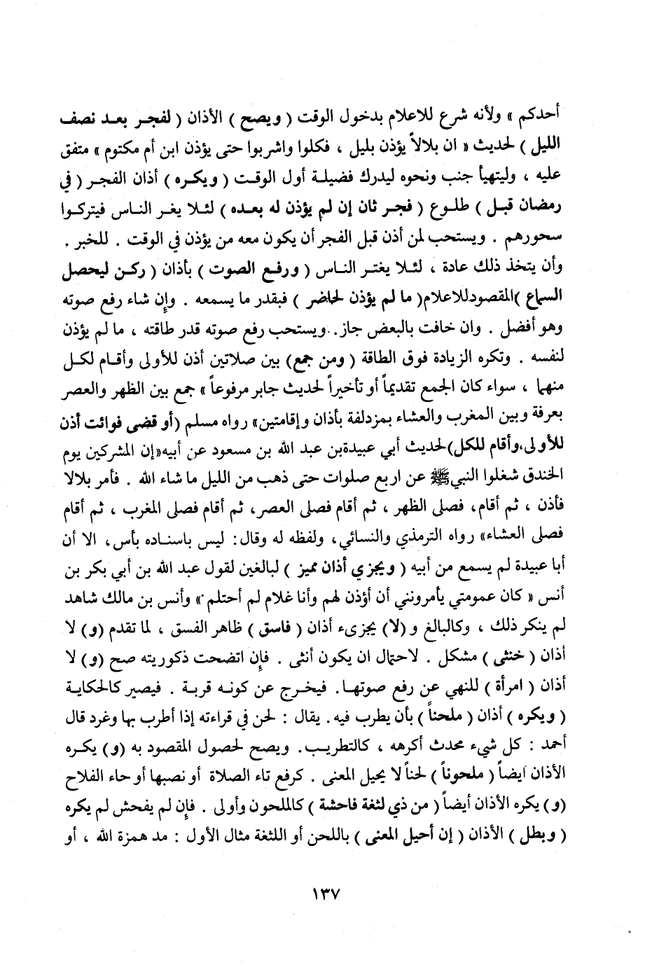 قَالَ أَحْمَدُ: كُلُّ شَيْءٍ مُحْدَثٍ أَكْرَهُهُ، كَالتَّطْرِيبِ. وَيَصِحُّ لِحُصُولِ الْمَقْصُودِ بِهِ (وَ) يُكْرَهُ الْأَذَانُ أَيْضًا (مَلْحُونًا) لَحْنًا لَا يُحِيلُ الْمَعْنَى. كَرَفْعِ تَاءِ الصَّلَاةِ أَوْ نَصْبِهَا أَوْ حَاءِ الْفَلَاحِ.