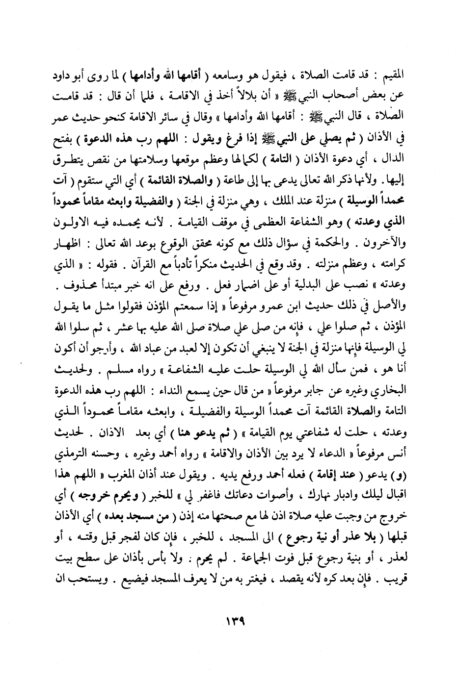 وَلِحَدِيثِ الْبُخَارِيِّ وَغَيْرِهِ عَنْ جَابِرٍ مَرْفُوعًا «مَنْ قَالَ حِينَ يَسْمَعُ النِّدَاءَ: اللَّهُمَّ رَبَّ هَذِهِ الدَّعْوَةِ التَّامَّةِ وَالصَّلَاةِ الْقَائِمَةِ آتِ مُحَمَّدًا الْوَسِيلَةَ وَالْفَضِيلَةَ، وَابْعَثْهُ مَقَامًا مَحْمُودًا الَّذِي وَعَدْته، حَلَّتْ لَهُ شَفَاعَتِي يَوْمَ الْقِيَامَةِ» (ثُمَّ يَدْعُو هُنَا) أَيْ بَعْدَ الْأَذَانِ.