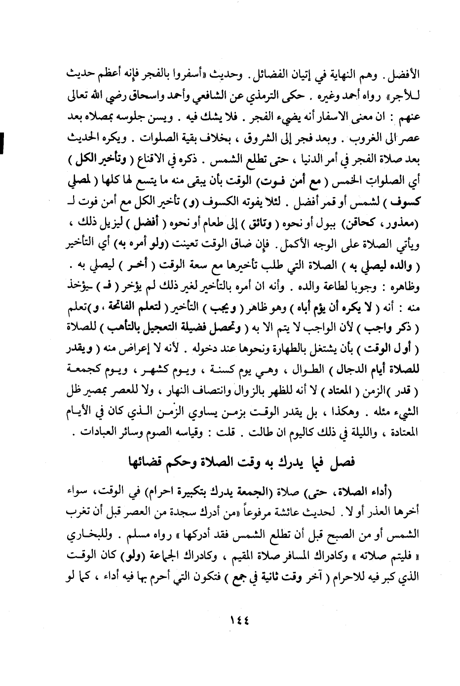 الْأَفْضَلَ وَهُمْ النِّهَايَةُ فِي إتْيَانِ الْفَضَائِلِ. وَحَدِيثُ «أَسْفِرُوا بِالْفَجْرِ فَإِنَّهُ أَعْظَمُ لِلْأَجْرِ» رَوَاهُ أَحْمَدُ وَغَيْرُهُ. حَكَى التِّرْمِذِيُّ عَنْ الشَّافِعِيِّ وَأَحْمَدَ وَإِسْحَاقَ رَضِيَ اللَّهُ تَعَالَى عَنْهُمْ: أَنَّ مَعْنَى الْإِسْفَارِ أَنَّهُ يُضِيءُ الْفَجْرُ فَلَا يُشَكُّ فِيهِ. وَيُسَنُّ جُلُوسُهُ بِمُصَلَّاهُ بَعْدَ عَصْرٍ إلَى الْغُرُوبِ وَبَعْدَ فَجْرِ الشُّرُوقِ، بِخِلَافِ بَقِيَّةِ الصَّلَوَاتِ. وَيُكْرَهُ الْحَدِيثُ بَعْدَ صَلَاةِ الْفَجْرِ فِي أَمْرِ الدُّنْيَا، حَتَّى تَطْلُعَ الشَّمْسُ.