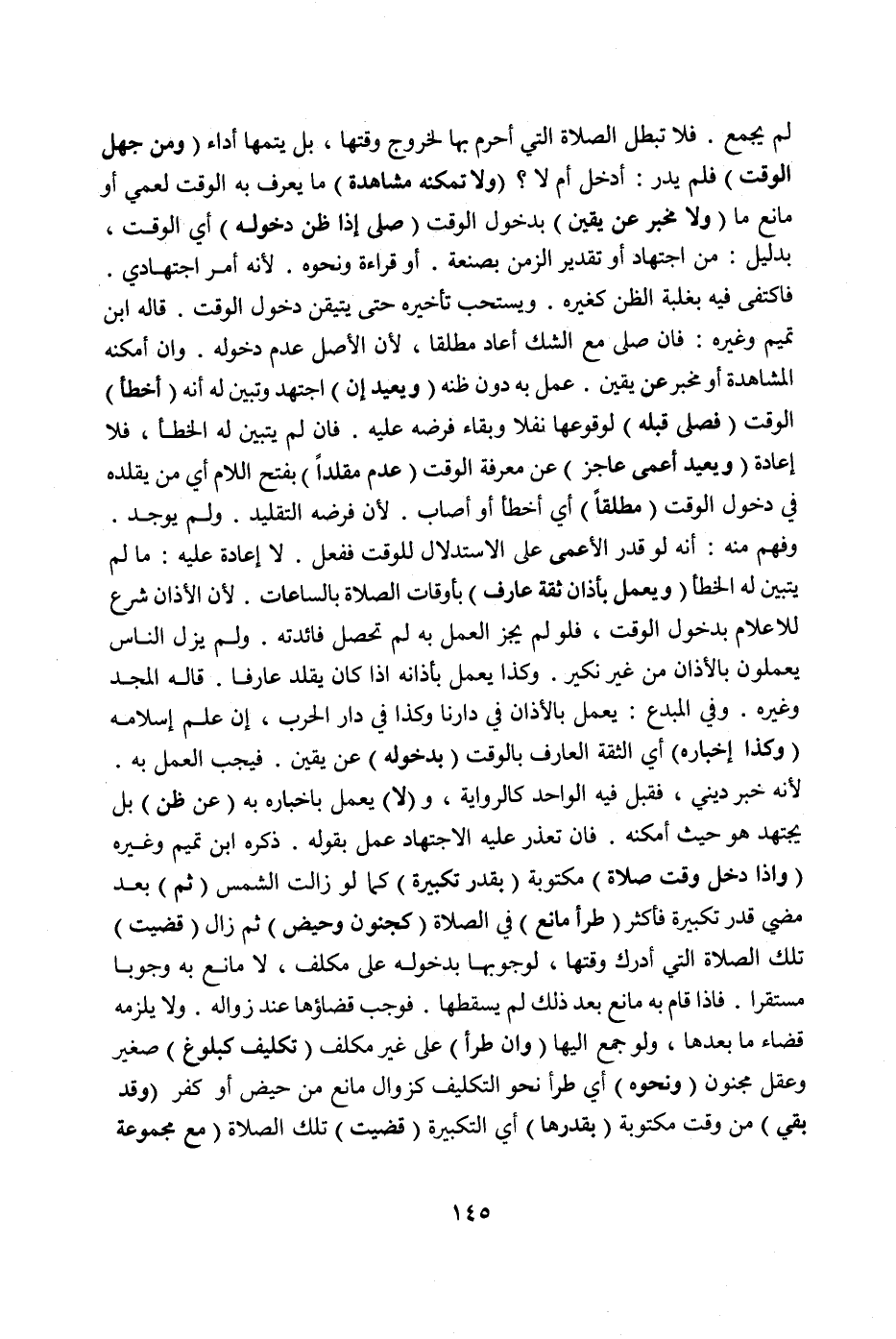 لَمْ يَجْمَعْ، فَلَا تَبْطُلُ الصَّلَاةُ الَّتِي أَحْرَمَ بِهَا لِخُرُوجِ وَقْتِهَا، بَلْ يُتِمُّهَا أَدَاءً (وَمَنْ جَهِلَ الْوَقْتَ) فَلَمْ يَدْرِ: أَدَخَلَ أَمْ لَا؟ (وَلَا تُمْكِنُهُ مُشَاهَدَةُ) مَا يُعْرَفُ بِهِ الْوَقْتُ لِعَمًى أَوْ مَانِعٍ مَا.