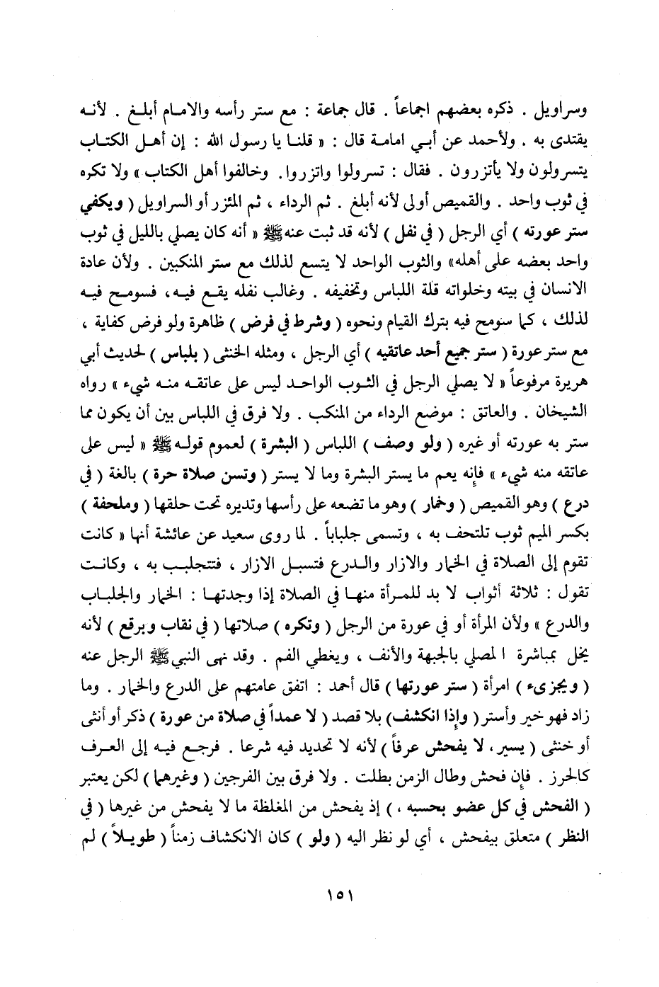 ذَكَرَهُ بَعْضُهُمْ إجْمَاعًا. قَالَ جَمَاعَةٌ: مَعَ سَتْرِ رَأْسِهِ وَالْإِمَامُ أَبْلَغُ ; لِأَنَّهُ يُقْتَدَى بِهِ. وَلِأَحْمَدَ عَنْ أَبِي أُمَامَةَ قَالَ: «قُلْنَا يَا رَسُولَ اللَّهِ: إنَّ أَهْلَ الْكِتَابِ يَتَسَرْوَلَونَ وَلَا يَأْتَزِرُونَ، فَقَالَ: تَسَرْوَلُوا وَاتَّزِرُوا، وَخَالِفُوا أَهْلَ الْكِتَابِ» وَلَا تُكْرَهُ فِي ثَوْبٍ وَاحِدٍ وَالْقَمِيصُ أَوْلَى لِأَنَّهُ أَبْلَغُ