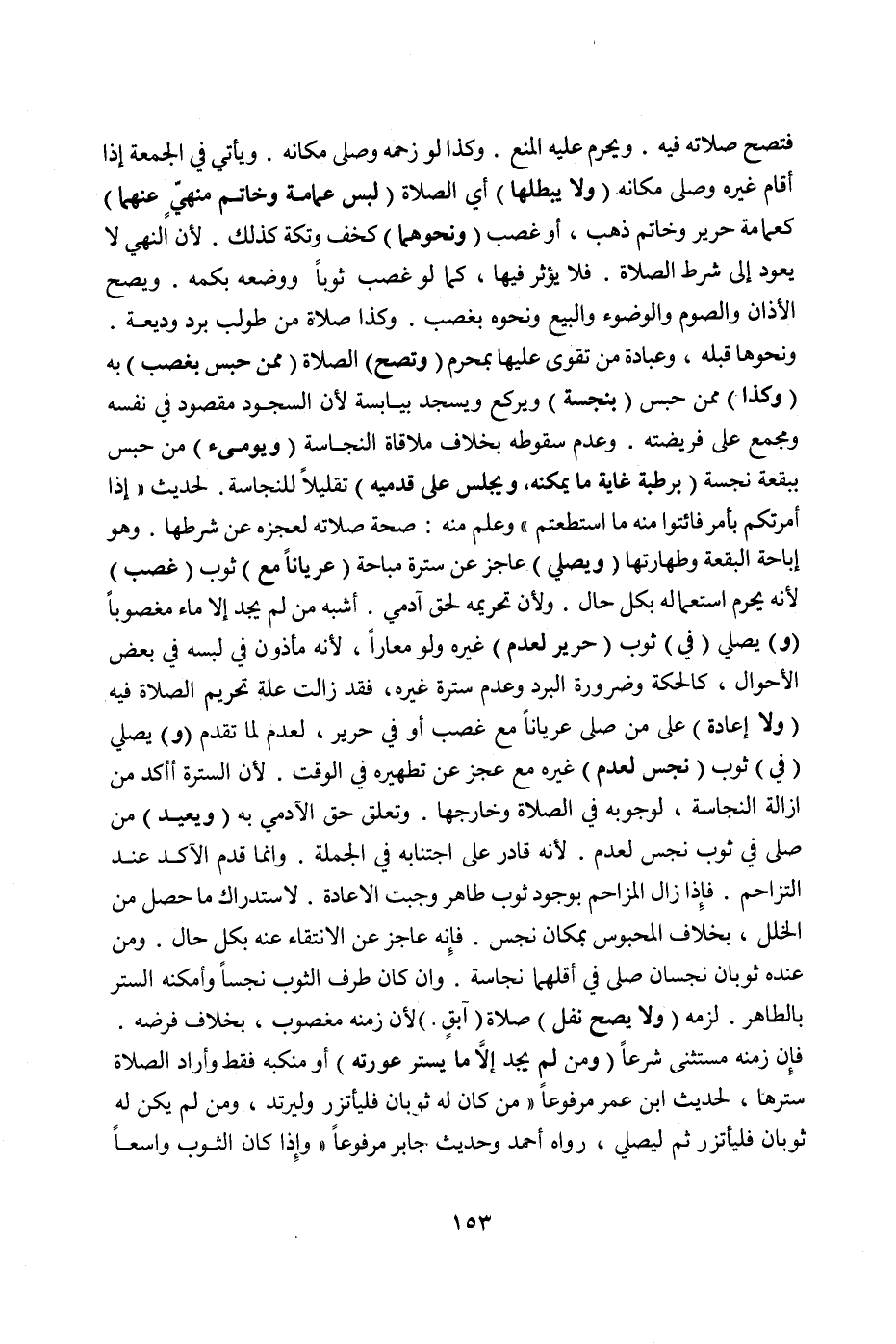 (وَ) يُصَلِّي (فِي) ثَوْبِ (حَرِيرٍ لِعَدَمِ) غَيْرِهِ وَلَوْ مُعَارًا، لِأَنَّهُ مَأْذُونٌ فِي لُبْسِهِ فِي بَعْضِ الْأَحْوَالِ، كَالْحَكَّةِ وَضَرُورَةِ الْبَرْدِ وَعَدَمِ سُتْرَةٍ غَيْرِهِ، فَقَدْ زَالَتْ عِلَّةُ تَحْرِيمِ الصَّلَاةِ فِيهِ (وَلَا إعَادَةَ) عَلَى مَنْ صَلَّى عُرْيَانًا مَعَ غَصْبٍ أَوْ فِي حَرِيرٍ، لِعَدَمٍ لِمَا تَقَدَّمَ.