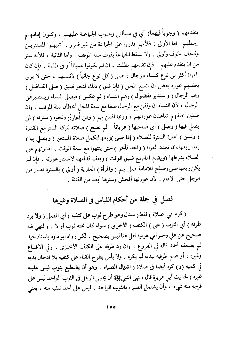 فَصْلٌ فِي جُمْلَةٍ مِنْ أَحْكَامِ اللِّبَاسِ فِي الصَّلَاةِ وَغَيْرِهَا (كُرِهَ فِي صَلَاةٍ) فَقَطْ (سَدْلٌ وَهُوَ طَرْحُ ثَوْبٍ عَلَى كَتِفَيْهِ) أَيْ الْمُصَلِّي (وَلَا يَرُدُّ طَرَفَهُ) أَيْ الثَّوْبِ (عَلَى) الْكَتِفِ (الْأُخْرَى) سَوَاءٌ كَانَ تَحْتَهُ ثَوْبٌ أَوْ لَا. وَالنَّهْيُ فِيهِ صَحِيحٌ عَنْ عَلِيٍّ وَخَبَرُ أَبِي هُرَيْرَةَ نُقِلَ هُنَا لَيْسَ بِصَحِيحٍ، لَكِنْ رَوَاهُ أَبُو دَاوُد بِإِسْنَادٍ جَيِّدٍ لَمْ يُضَعِّفْهُ أَحْمَدُ قَالَ فِي الْفُرُوعِ.