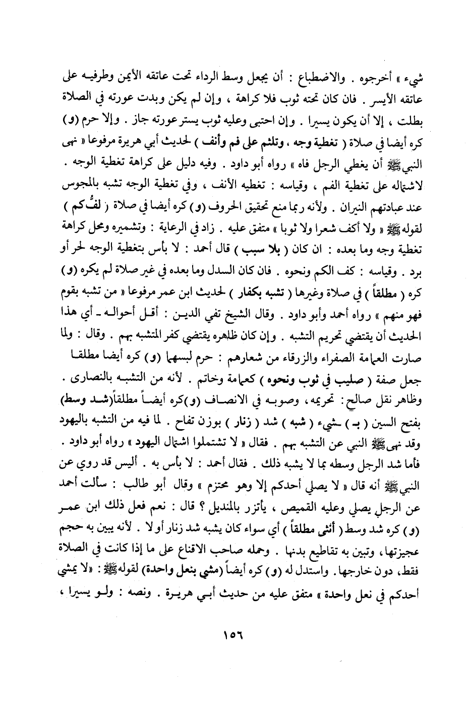 (وَ) كُرِهَ (مُطْلَقًا) فِي صَلَاةٍ وَغَيْرِهَا (تَشَبُّهٌ بِكُفَّارٍ) لِحَدِيثِ ابْنِ عُمَرَ مَرْفُوعًا «مَنْ تَشَبَّهَ بِقَوْمٍ فَهُوَ مِنْهُمْ» رَوَاهُ أَحْمَدُ وَأَبُو دَاوُد. وَقَالَ الشَّيْخُ تَقِيُّ الدِّينِ: أَقَلُّ أَحْوَالِهِ أَيْ هَذَا الْحَدِيث أَنْ يَقْتَضِيَ تَحْرِيمَ التَّشَبُّهِ، وَإِنْ كَانَ ظَاهِرُهُ يَقْتَضِي كُفْرَ الْمُتَشَبَّهِ بِهِمْ.