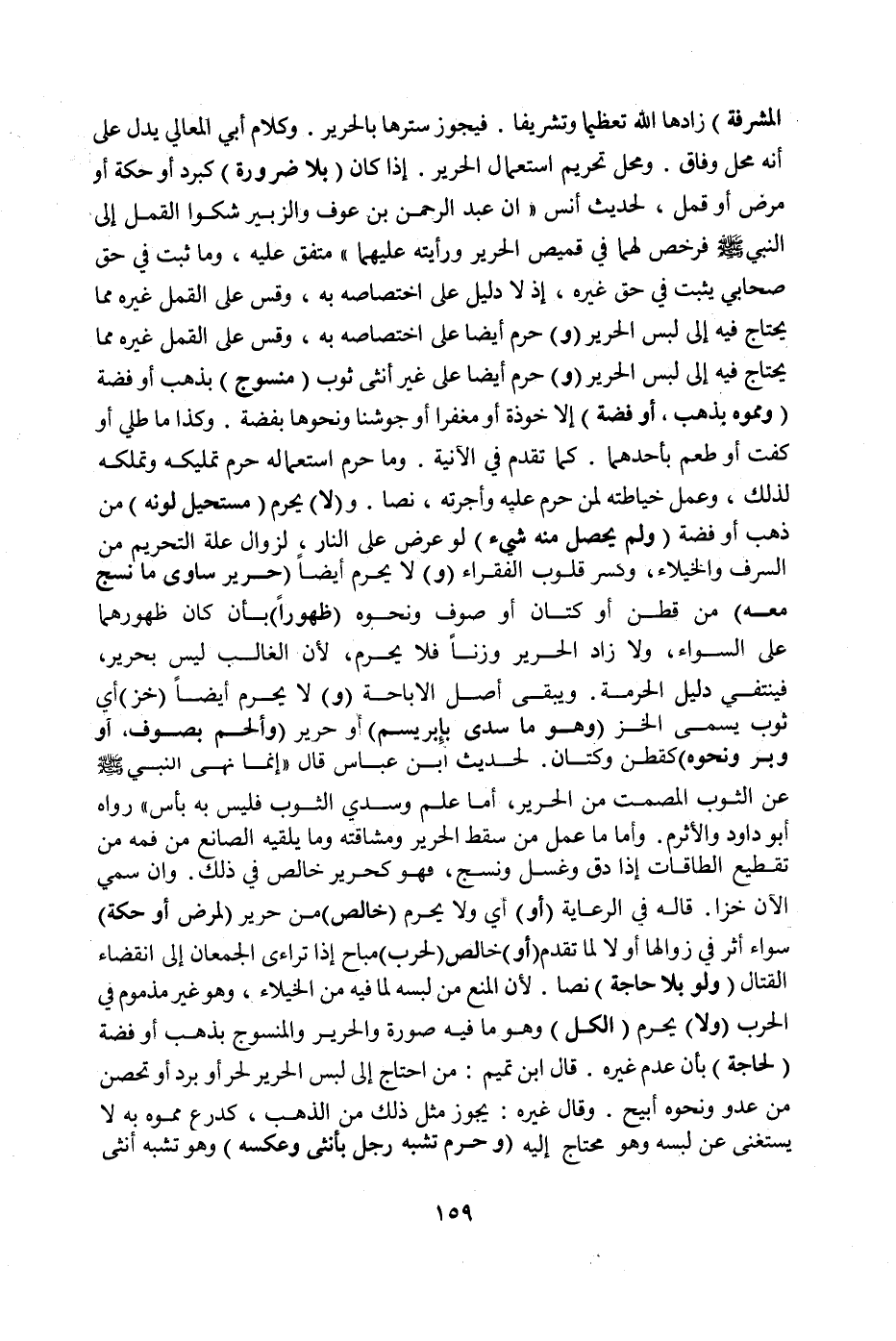 وَمَحَلُّ تَحْرِيمِ اسْتِعْمَالِ الْحَرِيرِ. إذَا كَانَ (بِلَا ضَرُورَةٍ) كَبَرْدٍ أَوْ حَكَّةٍ أَوْ مَرَضٍ أَوْ قَمْلٍ، لِحَدِيثِ أَنَسٍ «أَنَّ عَبْدَ الرَّحْمَنِ بْنَ عَوْفٍ وَالزُّبَيْرَ شَكَوْا الْقَمْلَ إلَى النَّبِيِّ صَلَّى اللَّهُ عَلَيْهِ وَسَلَّمَ فَرَخَّصَ لَهُمَا فِي قَمِيصِ الْحَرِيرِ وَرَأَيْتُهُ عَلَيْهِمَا» مُتَّفَقٌ عَلَيْهِ، وَمَا ثَبَتَ فِي حَقِّ صَحَابِيٍّ يَثْبُتُ فِي حَقِّ غَيْرِهِ، إذْ لَا دَلِيلَ عَلَى اخْتِصَاصِهِ بِهِ، وَقِسْ عَلَى الْقَمْلِ غَيْرَهُ مِمَّا يُحْتَاجُ فِيهِ إلَى لُبْسِ الْحَرِيرِ.