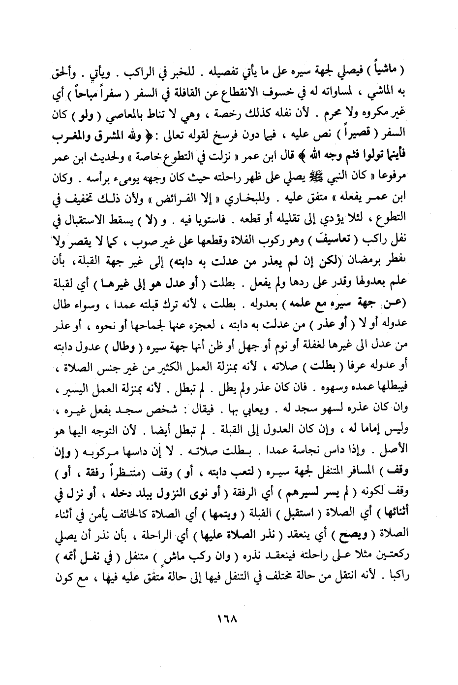 (مَاشِيًا) فَيُصَلِّي لِجِهَةِ سَيْرِهِ عَلَى مَا يَأْتِي تَفْصِيلُهُ لِلْخَبَرِ فِي الرَّاكِبِ وَيَأْتِي. وَأُلْحِقَ بِهِ الْمَاشِي، لِمُسَاوَاتِهِ لَهُ فِي خُسُوفِ الِانْقِطَاعِ عَنْ الْقَافِلَةِ فِي السَّفَرِ (سَفَرًا مُبَاحًا) أَيْ غَيْرَ مَكْرُوهٍ وَلَا مُحَرَّمٍ. لِأَنَّ نَفْلَهُ كَذَلِكَ رُخْصَةٌ، وَهِيَ لَا تُنَاطُ بِالْمَعَاصِي (وَلَوْ) كَانَ السَّفَرُ (قَصِيرًا) نَصَّ عَلَيْهِ، فِيمَا دُونَ فَرْسَخٍ لِقَوْلِهِ تَعَالَى: {وَلِلَّهِ الْمَشْرِقُ وَالْمَغْرِبُ فَأَيْنَمَا تُوَلُّوا فَثَمَّ وَجْهُ اللَّهِ} [البقرة: ١١٥] قَالَ ابْنُ عُمَرَ " نَزَلَتْ فِي التَّطَوُّعِ خَاصَّةً " وَلِحَدِيثِ ابْنِ عُمَرَ مَرْفُوعًا «كَانَ النَّبِيُّ صَلَّى اللَّهُ عَلَيْهِ وَسَلَّمَ يُصَلِّي عَلَى ظَهْرِ رَاحِلَتِهِ حَيْثُ كَانَ وَجْهُهُ يُومِئُ بِرَأْسِهِ وَكَانَ ابْنُ عُمَرَ يَفْعَلُهُ» مُتَّفَقٌ عَلَيْهِ،