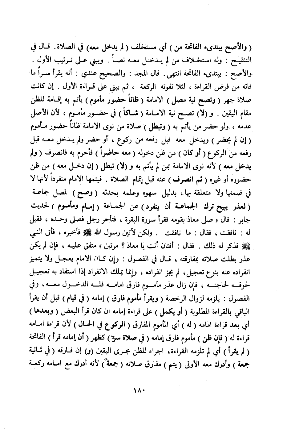 فَيُتِمُّهَا الْإِمَامُ مُنْفَرِدًا ; لِأَنَّهَا لَا فِي ضِمْنِهَا وَلَا مُتَعَلِّقَةً بِهَا، بِدَلِيلِ سَهْوِهِ وَعِلْمِهِ بِحَدَثِهِ (وَصَحَّ) لِمُصَلٍّ جَمَاعَةً (لِعُذْرٍ يُبِيحُ تَرْكَ الْجَمَاعَةِ أَنْ يَنْفَرِدَ) عَنْ الْجَمَاعَةِ (إمَامٌ وَمَأْمُومٌ) لِحَدِيثِ جَابِرٍ: قَالَ «صَلَّى مُعَاذٌ بِقَوْمِهِ فَقَرَأَ سُورَةَ الْبَقَرَةِ، فَتَأَخَّرَ رَجُلٌ فَصَلَّى وَحْدَهُ، فَقِيلَ لَهُ: نَافَقْتَ، فَقَالَ: مَا نَافَقْتُ، وَلَكِنْ لَآتِيَنَّ رَسُولَ اللَّهِ صَلَّى اللَّهُ عَلَيْهِ وَسَلَّمَ فَأُخْبِرُهُ فَأَتَى النَّبِيَّ صَلَّى اللَّهُ عَلَيْهِ وَسَلَّمَ فَذَكَرَ لَهُ ذَلِكَ، فَقَالَ: أَفَتَّانٌ أَنْتَ يَا مُعَاذُ؟ مَرَّتَيْنِ» مُتَّفَقٌ عَلَيْهِ.
