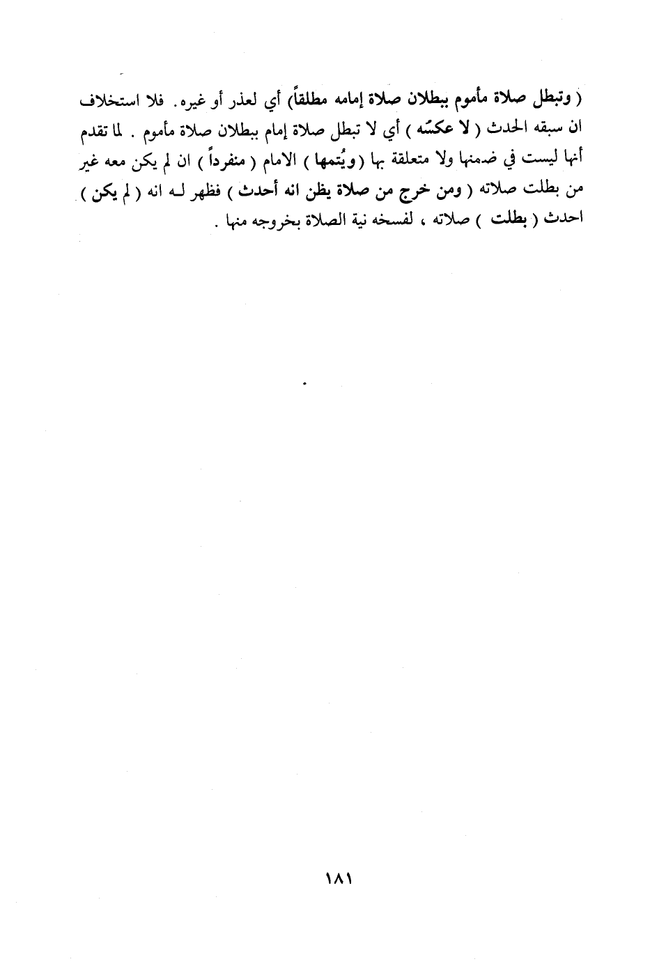 (وَتَبْطُلُ صَلَاةُ مَأْمُومٍ بِبُطْلَانِ صَلَاةِ إمَامِهِ مُطْلَقًا) أَيْ لِعُذْرٍ أَوْ غَيْرِهِ، فَلَا اسْتِخْلَافَ إنْ سَبَقَهُ الْحَدَثُ (لَا عَكْسُهُ) أَيْ لَا تَبْطُلُ صَلَاةُ إمَامٍ بِبُطْلَانِ صَلَاةِ مَأْمُومٍ لِمَا تَقَدَّمَ أَنَّهَا لَيْسَتْ فِي ضِمْنِهَا وَلَا مُتَعَلِّقَةً بِهَا (وَيُتِمُّهَا) الْإِمَامُ (مُنْفَرِدًا) إنْ لَمْ يَكُنْ مَعَهُ غَيْرُ مَنْ بَطَلَتْ صَلَاتُهُ (وَمَنْ خَرَجَ مِنْ صَلَاةٍ يَظُنُّ أَنَّهُ أَحْدَثَ) فَظَهَرَ لَهُ أَنَّهُ (لَمْ يَكُنْ) أَحْدَثَ (بَطَلَتْ) صَلَاتُهُ، لِفَسْخِهِ نِيَّةَ الصَّلَاةِ بِخُرُوجِهِ مِنْهَا.