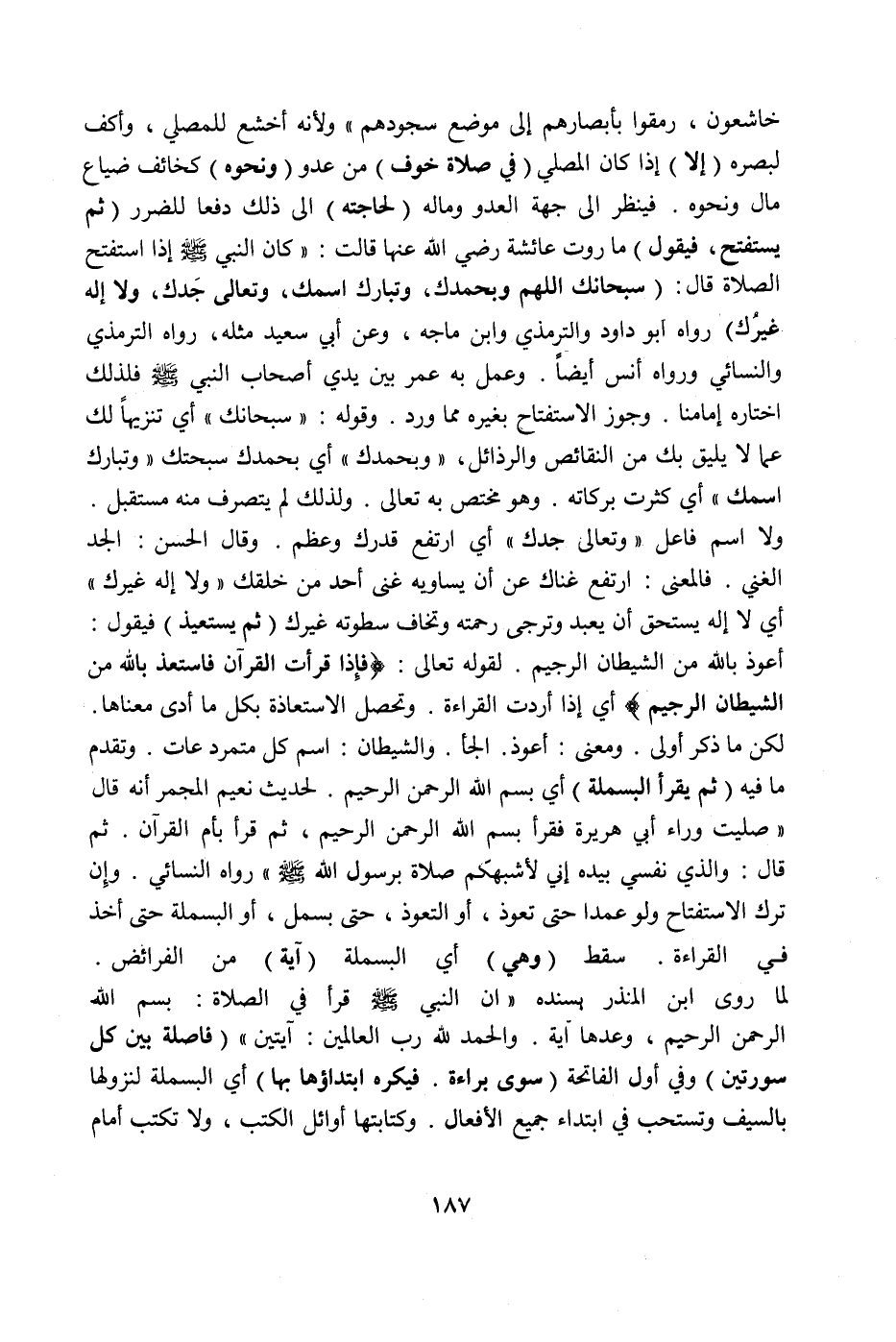 وَمَعْنَى أَعُوذُ: أَلْجَأُ، وَالشَّيْطَانُ: اسْمُ كُلِّ مُتَمَرِّدٍ عَاتٍ. وَتَقَدَّمَ مَا فِيهِ (ثُمَّ يَقْرَأُ الْبَسْمَلَةَ) أَيْ بِسْمِ اللَّهِ الرَّحْمَنِ الرَّحِيمِ. لِحَدِيثِ نُعَيْمٍ الْمُجْمِرِ أَنَّهُ قَالَ «صَلَّيْتُ وَرَاءَ أَبِي هُرَيْرَةَ فَقَرَأَ بِسْمِ اللَّهِ الرَّحْمَنِ الرَّحِيمِ، ثُمَّ قَرَأَ بِأُمِّ الْقُرْآنِ، ثُمَّ قَالَ: وَاَلَّذِي نَفْسِي بِيَدِهِ إنِّي لَأَشْبَهَكُمْ صَلَاةً بِرَسُولِ اللَّهِ صَلَّى اللَّهُ عَلَيْهِ وَسَلَّمَ» رَوَاهُ النَّسَائِيُّ.