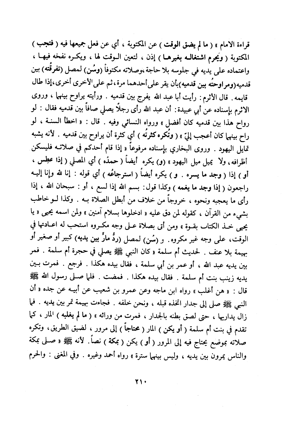 وَ (سُنَّ) لِمُصَلٍّ (رَدُّ مَارٍّ بَيْنَ يَدَيْهِ) كَبِيرٍ، أَوْ صَغِيرٍ، أَوْ بَهِيمَةٍ بِلَا عُنْفٍ لِحَدِيثِ أُمِّ سَلَمَةَ «كَانَ النَّبِيُّ صَلَّى اللَّهُ عَلَيْهِ وَسَلَّمَ يُصَلِّي فِي حُجْرَةِ أُمِّ سَلَمَةَ فَمَرَّ بَيْنَ يَدَيْهِ عَبْدُ اللَّهِ، أَوْ عُمَرُ بْنُ أَبِي سَلَمَةَ، فَقَالَ بِيَدِهِ هَكَذَا فَرَجَعَ، فَمَرَّتْ بَيْنَ يَدَيْهِ زَيْنَبُ بِنْتُ أُمِّ سَلَمَةَ فَقَالَ بِيَدِهِ هَكَذَا فَمَضَتْ، فَلَمَّا صَلَّى رَسُولُ اللَّهِ صَلَّى اللَّهُ عَلَيْهِ وَسَلَّمَ قَالَ: هُنَّ أَغْلَبُ» رَوَاهُ ابْنُ مَاجَهْ. وَعَنْ عَمْرُو بْنِ شُعَيْبٍ عَنْ أَبِيهِ عَنْ جَدِّهِ «أَنَّ النَّبِيَّ صَلَّى اللَّهُ عَلَيْهِ وَسَلَّمَ صَلَّى إلَى جِدَارٍ اتَّخَذَهُ قِبْلَةً، وَنَحْنُ خَلْفَهُ فَجَاءَتْ بَهِيمَةٌ تَمُرُّ بَيْنَ يَدَيْهِ فَمَا زَالَ يُدَارِيهَا، حَتَّى لَصِقَ بَطْنُهُ بِالْجِدَارِ، فَمَرَّتْ مِنْ وَرَائِهِ» (مَا لَمْ يَغْلِبْهُ) الْمَارُّ، كَمَا تَقَدَّمَ فِي بِنْتِ أُمِّ سَلَمَةَ (أَوْ يَكُنْ) الْمَارُّ (مُحْتَاجًا) إلَى مُرُورٍ، لِضِيقِ الطَّرِيقِ، وَتُكْرَهُ صَلَاتُهُ بِمَوْضِعٍ يُحْتَاجُ فِيهِ إلَى الْمُرُورِ (أَوْ) يَكُنْ (بِمَكَّةَ) نَصًّا ; لِأَنَّهُ صَلَّى اللَّهُ عَلَيْهِ وَسَلَّمَ «صَلَّى بِمَكَّةَ وَالنَّاسُ يَمُرُّونَ بَيْنَ يَدَيْهِ، وَلَيْسَ بَيْنَهُمَا سُتْرَةٌ» رَوَاهُ أَحْمَدُ وَغَيْرُهُ.