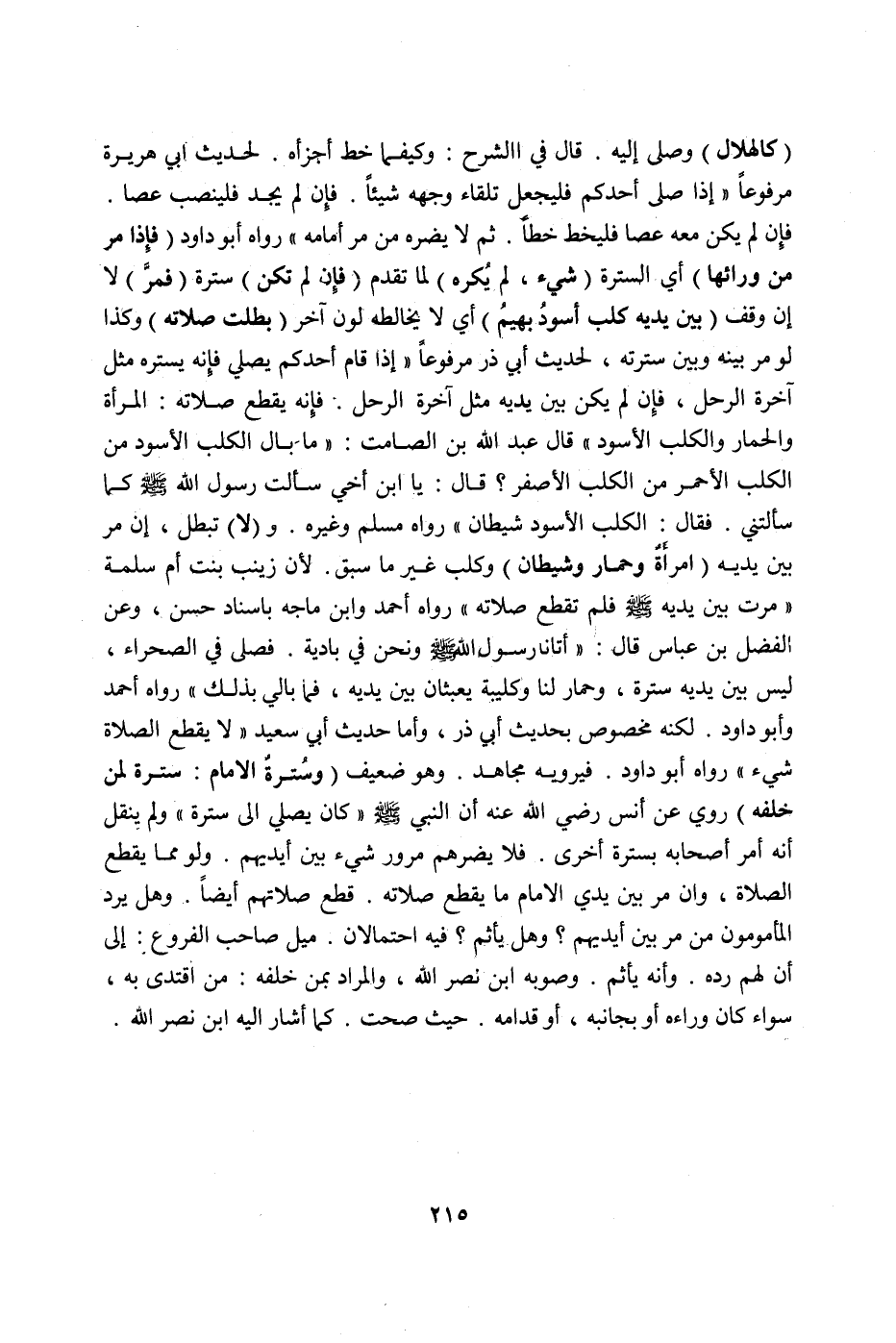 وَعَنْ الْفَضْلِ بْنِ عَبَّاسٍ قَالَ: «أَتَانَا رَسُولُ اللَّهِ صَلَّى اللَّهُ عَلَيْهِ وَسَلَّمَ وَنَحْنُ فِي بَادِيَةٍ فَصَلَّى فِي الصَّحْرَاءِ، لَيْسَ بَيْنَ يَدَيْهِ سُتْرَةٌ، وَحِمَارٌ لَنَا وَكُلَيْبَةٌ يَعْبَثَانِ بَيْنَ يَدَيْهِ، فَمَا بَالَى بِذَلِكَ» " رَوَاهُ أَحْمَدُ وَأَبُو دَاوُد. لَكِنَّهُ مَخْصُوصٌ بِحَدِيثِ أَبِي ذَرٍّ، وَأَمَّا حَدِيثُ أَبِي سَعِيدٍ «لَا يَقْطَعُ الصَّلَاةَ شَيْءٌ» " رَوَاهُ أَبُو دَاوُد فَيَرْوِيهِ مُجَاهِدٌ، وَهُوَ ضَعِيفٌ.