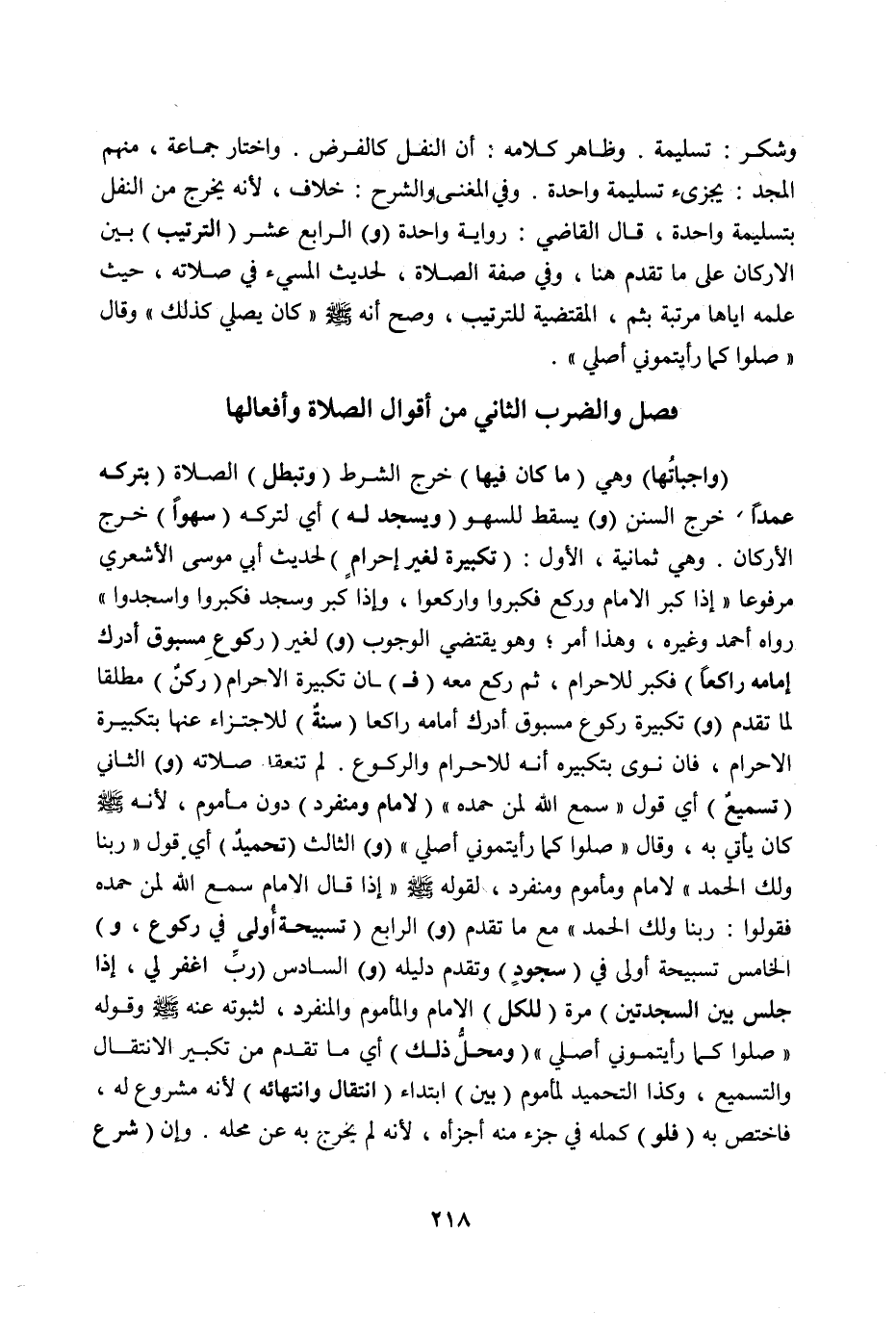 وَفِي الْمُغْنِي وَالشَّرْحِ: خِلَافٌ، لِأَنَّهُ يَخْرُجُ مِنْ النَّفْلِ بِتَسْلِيمَةٍ وَاحِدَةٍ، قَالَ الْقَاضِي: فِي رِوَايَةٍ وَاحِدَةٌ. (وَ) الرَّابِعَ عَشَرَ (التَّرْتِيبُ) بَيْنَ الْأَرْكَانِ عَلَى مَا تَقَدَّمَ هُنَا، وَفِي صِفَةِ الصَّلَاةِ، لِحَدِيثِ الْمُسِيءِ فِي صَلَاتِهِ، حَيْثُ عَلَّمَهُ إيَّاهَا مُرَتَّبَةً بِثُمَّ الْمُقْتَضِيَةِ لِلتَّرْتِيبِ، وَصَحَّ أَنَّهُ صَلَّى اللَّهُ عَلَيْهِ وَسَلَّمَ «كَانَ يُصَلِّي كَذَلِكَ» " وَقَالَ «: صَلُّوا كَمَا رَأَيْتُمُونِي أُصَلِّي» ". فَصْلٌ وَالضَّرْبُ الثَّانِي مِنْ أَقْوَالِ الصَّلَاةِ وَأَفْعَالِهَا.