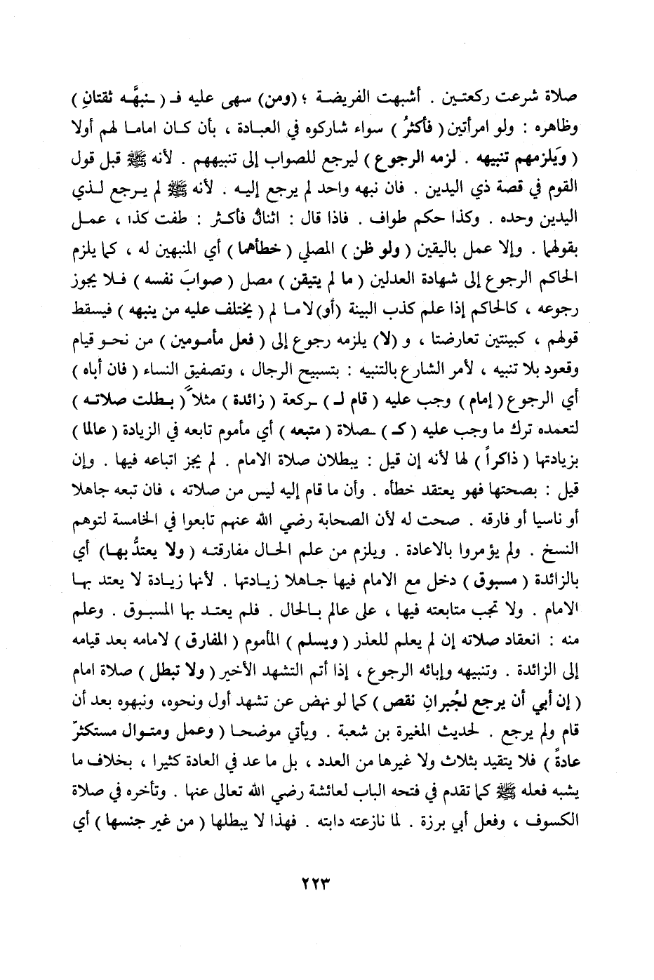 (وَلَوْ ظَنَّ) الْمُصَلِّي (خَطَأَهُمَا) أَيْ: الْمُنَبِّهَيْنِ لَهُ، كَمَا يَلْزَمُ الْحَاكِمَ الرُّجُوعُ إلَى شَهَادَةِ الْعَدْلَيْنِ (مَا لَمْ يَتَيَقَّنْ) مُصَلٍّ (صَوَابَ نَفْسِهِ) فَلَا يَجُوزُ رُجُوعُهُ، كَالْحَاكِمِ إذَا عَلِمَ كَذِبَ الْبَيِّنَةِ (أَوْ) لَا مَا لَمْ (يَخْتَلِفْ عَلَيْهِ مَنْ يُنَبِّهُهُ) فَيَسْقُطُ قَوْلُهُمْ، كَبَيِّنَتَيْنِ تَعَارَضَتَا، وَ (لَا) يَلْزَمُهُ رُجُوعٌ إلَى (فِعْلِ مَأْمُومِينَ) مِنْ نَحْوِ قِيَامٍ وَقُعُودٍ بِلَا تَنْبِيهٍ، لِأَمْرِ الشَّارِعِ بِالتَّنْبِيهِ: بِتَسْبِيحِ الرِّجَالِ، وَتَصْفِيقِ النِّسَاءِ.