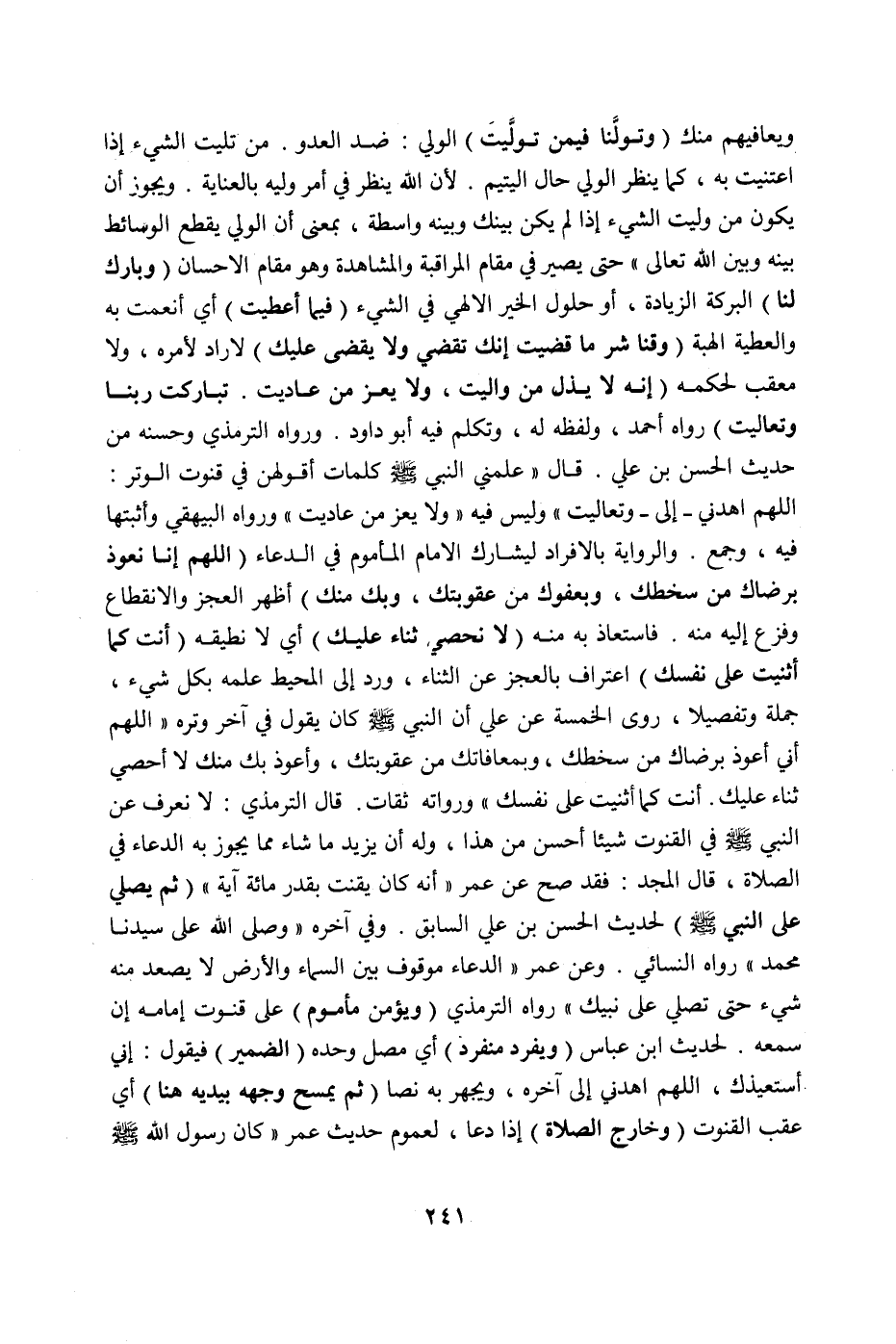 قَالَ «: عَلَّمَنِي النَّبِيُّ صَلَّى اللَّهُ عَلَيْهِ وَسَلَّمَ كَلِمَاتٍ أَقُولُهُنَّ فِي قُنُوتِ الْوِتْرِ: اللَّهُمَّ اهْدِنِي - إلَى - وَتَعَالَيْتَ» " وَلَيْسَ فِيهِ «وَلَا يَعِزُّ مَنْ عَادَيْتَ» " وَرَوَاهُ الْبَيْهَقِيُّ وَأَثْبَتَهَا فِيهِ، وَجَمَعَ، وَالرِّوَايَةُ بِالْإِفْرَادِ لِيُشَارِكَ الْإِمَامَ الْمَأْمُومُ فِي الدُّعَاءِ (اللَّهُمَّ إنَّا نَعُوذُ بِرِضَاك مِنْ سَخَطِك، وَبِعَفْوِك مِنْ عُقُوبَتِك، وَبِك مِنْك) أَظْهَرَ الْعَجْزَ وَالِانْقِطَاعَ وَفَزِعَ إلَيْهِ مِنْهُ فَاسْتَعَاذَ بِهِ مِنْهُ.