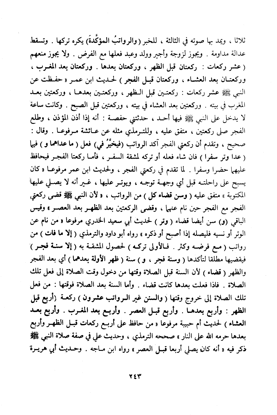 مُتَّفَقٌ عَلَيْهِ، وَلِلتِّرْمِذِيِّ مِثْلُهُ عَنْ عَائِشَةَ مَرْفُوعًا وَقَالَ: صَحِيحٌ، وَتَقَدَّمَ أَنَّ رَكْعَتَيْ الْفَجْرِ آكَدُ الرَّوَاتِبِ (فَيُخَيَّرُ فِي) فِعْلِ (مَا عَدَاهُمَا وَ) فِيمَا (عَدَا وِتْرٍ سَفَرًا) فَإِنْ شَاءَ فَعَلَهُ، أَوْ تَرَكَهُ لِمَشَقَّةِ السَّفَرِ، فَأَمَّا رَكْعَتَا الْفَجْرِ فَيُحَافِظُ عَلَيْهِمَا حَضَرًا وَسَفَرًا لِمَا تَقَدَّمَ فِي رَكْعَتَيْ الْفَجْرِ، وَلِحَدِيثِ ابْنِ عُمَرَ مَرْفُوعًا «كَانَ يُسَبِّحُ عَلَى رَاحِلَتِهِ قِبَلَ أَيِّ وِجْهَةٍ تَوَجَّهَ، وَيُوتِرُ عَلَيْهَا، غَيْرَ أَنَّهُ لَا يُصَلِّي عَلَيْهَا الْمَكْتُوبَةَ» " مُتَّفَقٌ عَلَيْهِ.