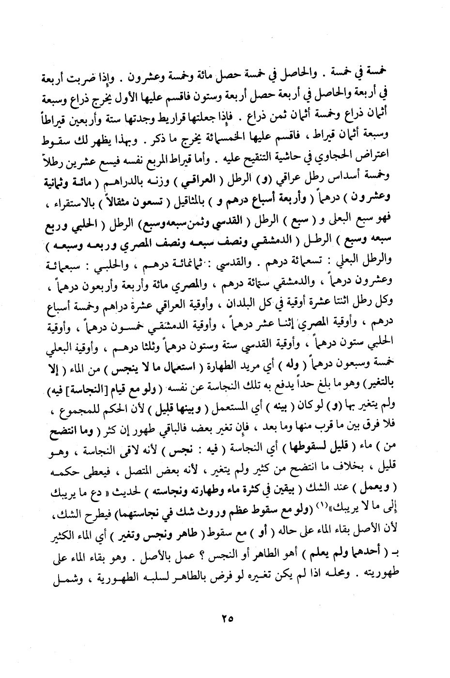 وَالْقُدْسِيُّ: ثَمَانِمِائَةُ دِرْهَمٍ، وَالْحَلَبِيُّ: سَبْعُمِائَةٍ وَعِشْرُونَ دِرْهَمًا، وَالدِّمَشْقِيُّ سِتّمِائَةِ دِرْهَمٍ، وَالْمِصْرِيُّ مِائَةٌ وَأَرْبَعَةٌ وَأَرْبَعُونَ دِرْهَمًا، وَكُلُّ رِطْلٍ اثْنَتَا عَشْرَةَ أُوقِيَّةً فِي كُلِّ الْبُلْدَانِ، وَأُوقِيَّةُ الْعِرَاقِيِّ عَشَرَةُ دَرَاهِمَ وَخَمْسَةُ أَسْبَاعِ دِرْهَمٍ، وَأُوقِيَّةُ الْمِصْرِيِّ اثْنَا عَشَرَ دِرْهَمًا، وَأُوقِيَّةُ الدِّمَشْقِيِّ خَمْسُونَ دِرْهَمًا، وَأُوقِيَّةُ الْحَلَبِيِّ سِتُّونَ دِرْهَمًا، وَأُوقِيَّةُ الْقُدْسِيِّ سِتَّةٌ وَسِتُّونَ دِرْهَمًا وَثُلُثَا دِرْهَمٍ، وَأُوقِيَّةُ الْبَعْلِيِّ خَمْسَةٌ وَسَبْعُونَ دِرْهَمًا (وَلَهُ) أَيْ مُرِيدِ الطَّهَارَةِ (اسْتِعْمَالُ مَا لَا يَنْجُسُ) مِنْ الْمَاءِ (إلَّا بِالتَّغَيُّرِ) وَهُوَ مَا بَلَغَ حَدًّا يَدْفَعُ بِهِ تِلْكَ النَّجَاسَةَ عَنْ نَفْسِهِ (وَلَوْ مَعَ قِيَامِ [النَّجَاسَةِ] فِيهِ) وَلَمْ يَتَغَيَّرْ بِهَا.