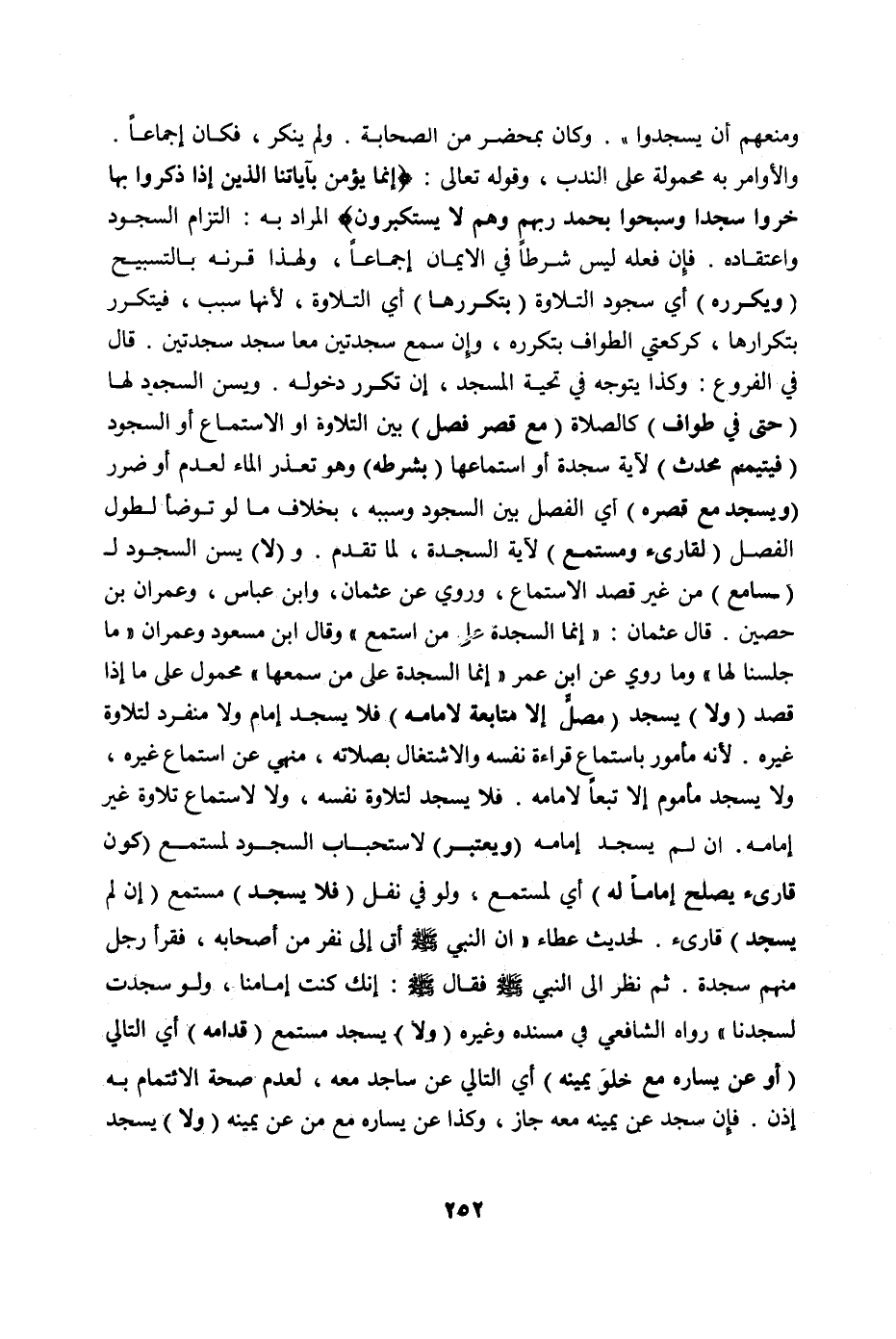 وَمَنَعَهُمْ أَنْ يَسْجُدُوا ". وَكَانَ بِمَحْضَرٍ مِنْ الصَّحَابَةِ وَلَمْ يُنْكَرْ، فَكَانَ إجْمَاعًا وَالْأَوَامِرُ بِهِ مَحْمُولَةٌ عَلَى النَّدْبِ، وقَوْله تَعَالَى: {إنَّمَا يُؤْمِنُ بِآيَاتِنَا الَّذِينَ إذَا ذُكِّرُوا بِهَا خَرُّوا سُجَّدًا وَسَبَّحُوا بِحَمْدِ رَبِّهِمْ وَهُمْ لَا يَسْتَكْبِرُونَ} [السجدة: ١٥] " الْمُرَادُ بِهِ: الْتِزَامُ السُّجُودِ وَاعْتِقَادُهُ فَإِنَّ فِعْلَهُ لَيْسَ شَرْطًا فِي الْإِيمَانِ إجْمَاعًا، وَلِهَذَا قَرَنَهُ بِالتَّسْبِيحِ.