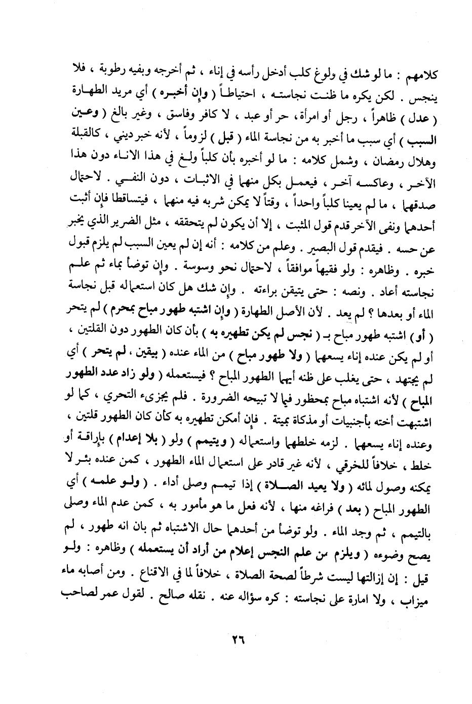 (وَإِنْ أَخْبَرَهُ) أَيْ مُرِيدَ الطَّهَارَةِ (عَدْلٌ) ظَاهِرًا، رَجُلٌ أَوْ امْرَأَةٌ، حُرٌّ أَوْ عَبْدٌ، لَا كَافِرٌ وَفَاسِقٌ، وَغَيْرُ بَالِغٍ (وَعَيَّنَ السَّبَبَ) أَيْ سَبَبَ مَا أَخْبَرَ بِهِ مِنْ نَجَاسَةِ الْمَاءِ (قُبِلَ) لُزُومًا، لِأَنَّهُ خَبَرٌ دِينِيٌّ، كَالْقِبْلَةِ وَهِلَالِ رَمَضَانَ، وَشَمِل كَلَامُهُ: مَا لَوْ أَخْبَرَهُ بِأَنَّ كَلْبًا وَلَغَ فِي هَذَا الْإِنَاءِ دُونَ هَذَا الْآخِرِ، وَعَاكَسَهُ آخَرُ، فَيُعْمَلُ بِكُلٍّ مِنْهُمَا فِي الْإِثْبَاتِ، دُونَ النَّفْيِ.