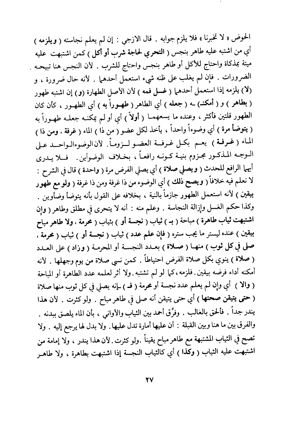 (وَ) إنْ اشْتَبَهَ طَهُورٌ (بِطَاهِرٍ) وَ (أَمْكَنَ) هـ (جَعْلُهُ) أَيْ الطَّاهِرَ (طَهُورًا بِهِ) أَيْ الطَّهُورَ، كَأَنْ كَانَ الطَّهُورُ قُلَّتَيْنِ فَأَكْثَرَ، وَعِنْدَهُ مَا يَسَعُهُمَا (أَوْ لَا) أَيْ أَوْ لَمْ يُمْكِنْهُ جَعْلُهُ طَهُورًا بِهِ (يَتَوَضَّأُ مَرَّةً) أَيْ وُضُوءًا وَاحِدًا، يَأْخُذُ لِكُلِّ عُضْوٍ (مِنْ ذَا) الْمَاءِ (غَرْفَةً، وَمِنْ ذَا) الْمَاءِ (غَرْفَةً) يَعُمُّ بِكُلِّ غَرْفَةٍ الْعُضْوَ لُزُومًا لِأَنَّ الْوُضُوءَ الْوَاحِدَ عَلَى الْوَجْهِ الْمَذْكُورِ مَجْزُومٌ بِنِيَّةِ كَوْنِهِ رَافِعًا، بِخِلَافِ الْوُضُوءَيْنِ فَلَا يُدْرَى أَيُّهُمَا الرَّافِعُ لِلْحَدَثِ.