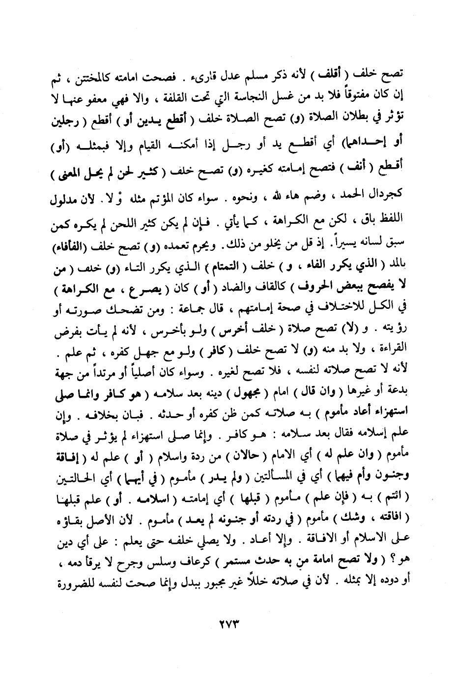 تَصِحُّ خَلْفَ (أَقَلْفَ) لِأَنَّهُ ذَكَرٌ مُسْلِمٌ عَدْلٌ قَارِئٌ فَصَحَّتْ إمَامَتُهُ كَالْمُخْتَتَنِ، ثُمَّ إنْ كَانَ مَفْتُوقًا فَلَا بُدَّ مِنْ غَسْلِ النَّجَاسَةِ الَّتِي تَحْتَ الْقَلَفَةِ، وَإِلَّا فَهِيَ مَعْفُوٌّ عَنْهَا لَا تُؤَثِّرُ فِي بُطْلَانِ الصَّلَاةِ.