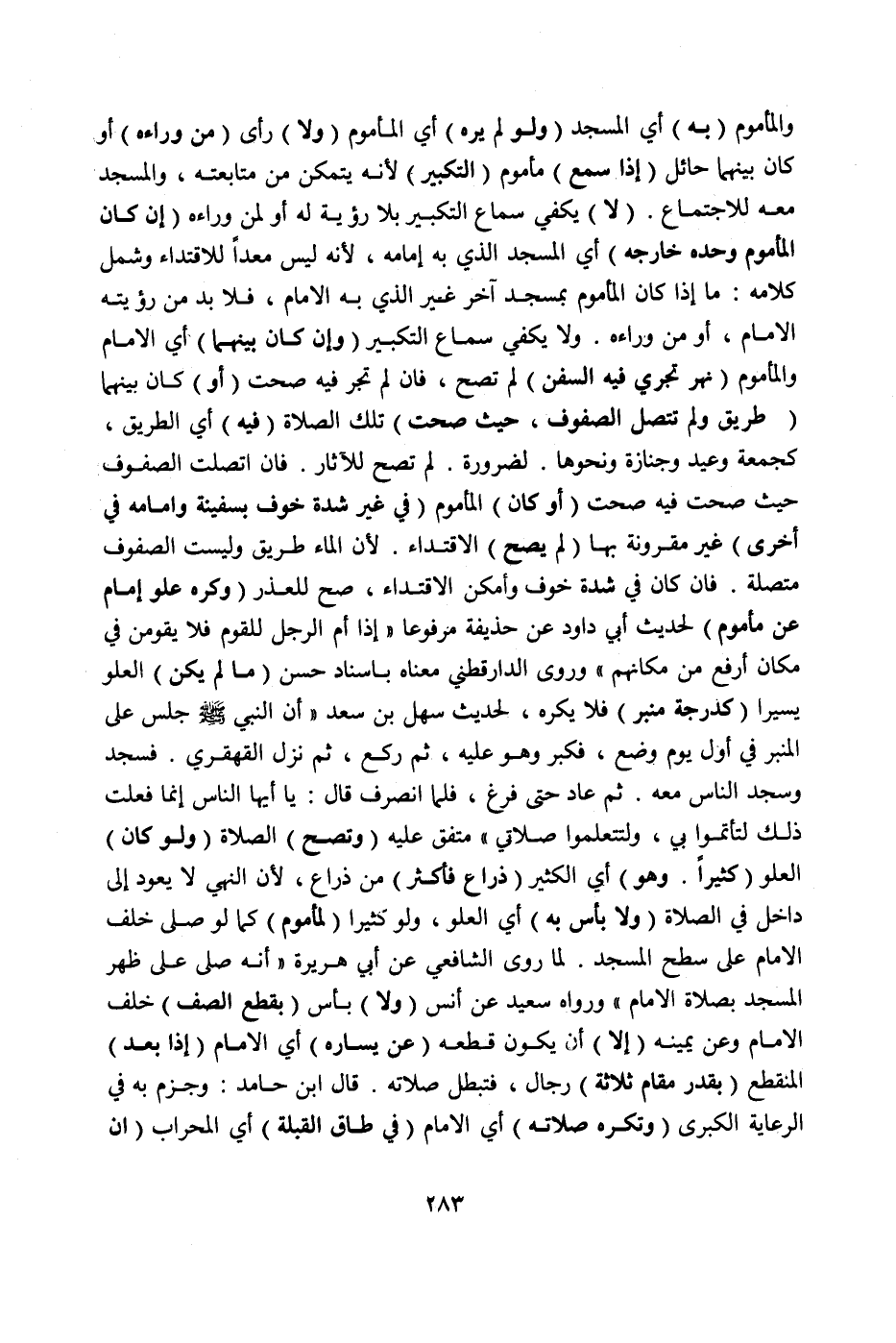 وَلَا يَكْفِي سَمَاعُ التَّكْبِيرِ (وَإِنْ كَانَ بَيْنَهُمَا) أَيْ: الْإِمَامِ وَالْمَأْمُومِ (نَهْرٌ تَجْرِي فِيهِ السُّفُنُ) لَمْ تَصِحَّ، فَإِنْ لَمْ تَجْرِ فِيهِ صَحَّتْ (أَوْ) كَانَ بَيْنَهُمَا (طَرِيقٌ وَلَمْ تَتَّصِلْ الصُّفُوفُ، حَيْثُ صَحَّتْ) تِلْكَ الصَّلَاةُ (فِيهِ) أَيْ: الطَّرِيقِ، كَجُمُعَةٍ وَعِيدٍ وَجِنَازَةٍ وَنَحْوِهَا لِضَرُورَةٍ لَمْ تَصِحَّ لِلْآثَارِ،