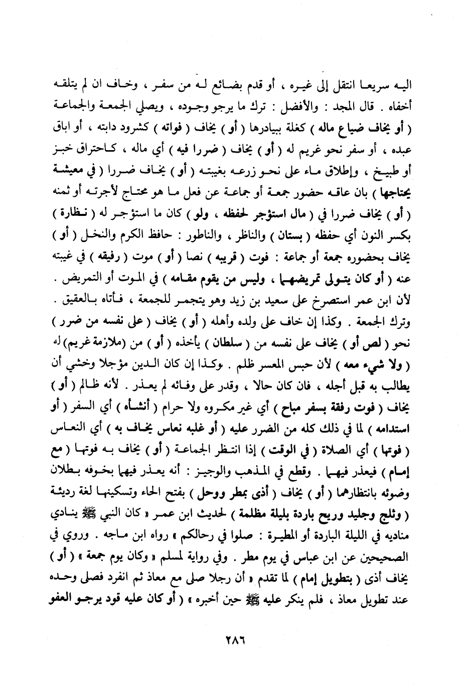 وَرُوِيَ فِي الصَّحِيحَيْنِ عَنْ ابْنِ عَبَّاسٍ فِي يَوْمِ مَطَرٍ وَفِي رِوَايَةِ لِمُسْلِمٍ «وَكَانَ يَوْمُ جُمُعَةٍ» " (أَوْ) يَخَافُ أَذًى (بِتَطْوِيلِ إمَامٍ) لِمَا تَقَدَّمَ أَنَّ رَجُلًا صَلَّى مَعَ مُعَاذٍ ثُمَّ انْفَرَدَ فَصَلَّى وَحْدَهُ عِنْدَ تَطْوِيلِ مُعَاذٍ، فَلَمْ يُنْكِرْ عَلَيْهِ صَلَّى اللَّهُ عَلَيْهِ وَسَلَّمَ حِينَ أَخْبَرَهُ " (أَوْ كَانَ عَلَيْهِ قَوَدٌ يَرْجُو الْعَفْوَ