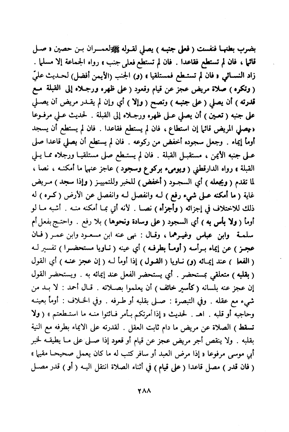 (وَتُكْرَهُ) صَلَاةُ مَرِيضٍ عَجَزَ عَنْ قِيَامٍ وَقُعُودٍ (عَلَى ظَهْرِهِ وَرِجْلَاهُ إلَى الْقِبْلَةِ مَعَ قُدْرَتِهِ) أَنْ يُصَلِّيَ (عَلَى جَنْبِهِ) وَتَصِحُّ (وَإِلَّا) أَيْ: وَإِنْ لَمْ يَقْدِرْ مَرِيضٌ أَنْ يُصَلِّيَ عَلَى جَنْبِهِ (تَعَيَّنَ) أَنْ يُصَلِّيَ عَلَى ظَهْرِهِ وَرِجْلَاهُ إلَى الْقِبْلَةِ لِحَدِيثِ عَلِيٍّ مَرْفُوعًا «يُصَلِّي الْمَرِيضُ قَائِمًا إنْ اسْتَطَاعَ، فَإِنْ لَمْ يَسْتَطِعْ فَقَاعِدًا. فَإِنْ لَمْ يَسْتَطِعْ أَنْ يَسْجُدَ، أَوْمَأَ إيمَاءً. وَجَعَلَ سُجُودَهُ أَخْفَضَ مِنْ رُكُوعِهِ. فَإِنْ لَمْ يَسْتَطِعْ أَنْ يُصَلِّيَ قَاعِدًا صَلَّى عَلَى جَنْبِهِ الْأَيْمَنِ، مُسْتَقْبِلَ الْقِبْلَةِ فَإِنْ لَمْ يَسْتَطِعْ صَلَّى مُسْتَلْقِيًا وَرِجْلَاهُ مِمَّا يَلِي الْقِبْلَةَ» " رَوَاهُ الدَّارَقُطْنِيُّ