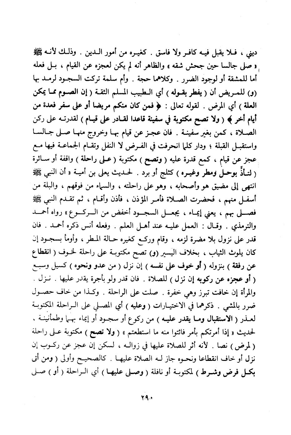 فَإِنْ قَدَرَ وَلَوْ بِأُجْرَةٍ يَقْدِرُ عَلَيْهَا نَزَلَ وَالْمَرْأَةُ إنْ خَافَتْ تَبْرُزُ وَهِيَ خَفِرَةٌ صَلَّتْ عَلَى الرَّاحِلَةِ وَكَذَا مَنْ خَافَ حُصُولَ ضَرَرٍ بِالْمَشْيِ ذَكَرَهُمَا فِي الِاخْتِيَارَاتِ (وَعَلَيْهِ) أَيْ: الْمُصَلِّي عَلَى الرَّاحِلَةِ الْمَكْتُوبَةُ لِعُذْرِ (الِاسْتِقْبَالِ وَمَا يَقْدِرُ عَلَيْهِ) مِنْ رُكُوعٍ، أَوْ سُجُودٍ، أَوْ إيمَاءٍ بِهِمَا، وَطُمَأْنِينَةٍ لِحَدِيثِ «إذَا أَمَرْتُكُمْ بِأَمْرٍ فَأْتُوا مِنْهُ مَا اسْتَطَعْتُمْ» " (وَلَا تَصِحُّ) مَكْتُوبَةٌ عَلَى رَاحِلَةٍ (لِمَرَضٍ) نَصًّا لِأَنَّهُ أَثَرٌ لِلصَّلَاةِ عَلَيْهَا فِي زَوَالِهِ، لِسَكَنٍ إنْ عَجَزَ عَنْ رُكُوبٍ إنْ نَزَلَ، أَوْ خَافَ انْقِطَاعًا وَنَحْوَهُ جَازَ لَهُ الصَّلَاةُ عَلَيْهَا كَالصَّحِيحِ وَأَوْلَى.