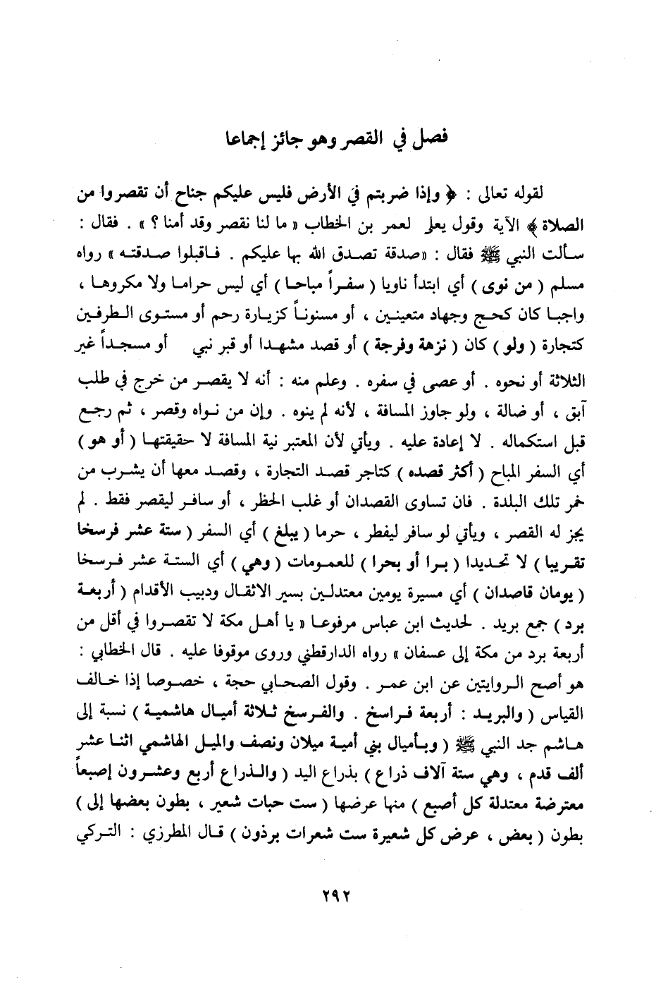لِحَدِيثِ ابْنِ عَبَّاسٍ مَرْفُوعًا «يَا أَهْلَ مَكَّةَ لَا تَقْصُرُوا فِي أَقَلَّ مِنْ أَرْبَعَةِ بُرُدٍ مِنْ مَكَّةَ إلَى عُسْفَانَ» " رَوَاهُ الدَّارَقُطْنِيُّ وَرُوِيَ مَوْقُوفًا عَلَيْهِ.