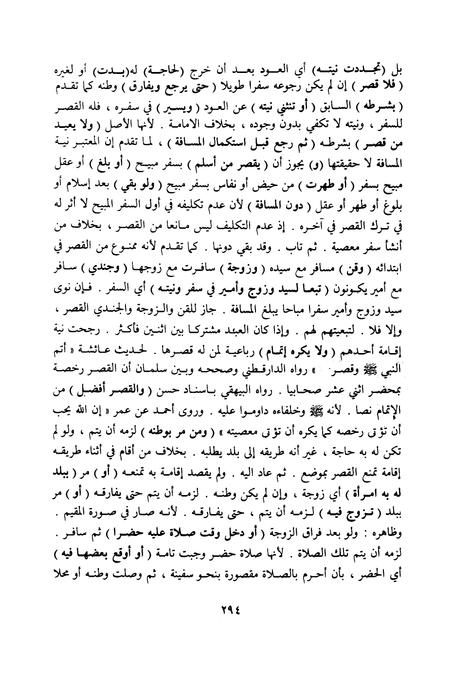 بَلْ (تَجَدَّدَتْ نِيَّتُهُ) أَيْ: الْعَوْدِ بَعْدَ أَنْ خَرَجَ (لِحَاجَةٍ) لَهُ (بَدَتْ) ، أَوْ لِغَيْرِهِ (فَلَا قَصْرَ) إنْ لَمْ يَكُنِ رُجُوعُهُ سَفَرًا طَوِيلًا (حَتَّى يَرْجِعَ وَيُفَارِقَ) وَطَنَهُ كَمَا تَقَدَّمَ (بِشَرْطِهِ) السَّابِقِ (أَوْ تَنْثَنِيَ نِيَّتُهُ) عَنْ الْعَوْدِ (وَيَسِيرَ) فِي سَفَرِهِ، فَلَهُ الْقَصْرُ لِلسَّفَرِ، وَنِيَّتُهُ لَا تَكْفِي بِدُونِ وُجُودِهِ، بِخِلَافِ الْإِمَامَةِ لِأَنَّهَا الْأَصْلُ.