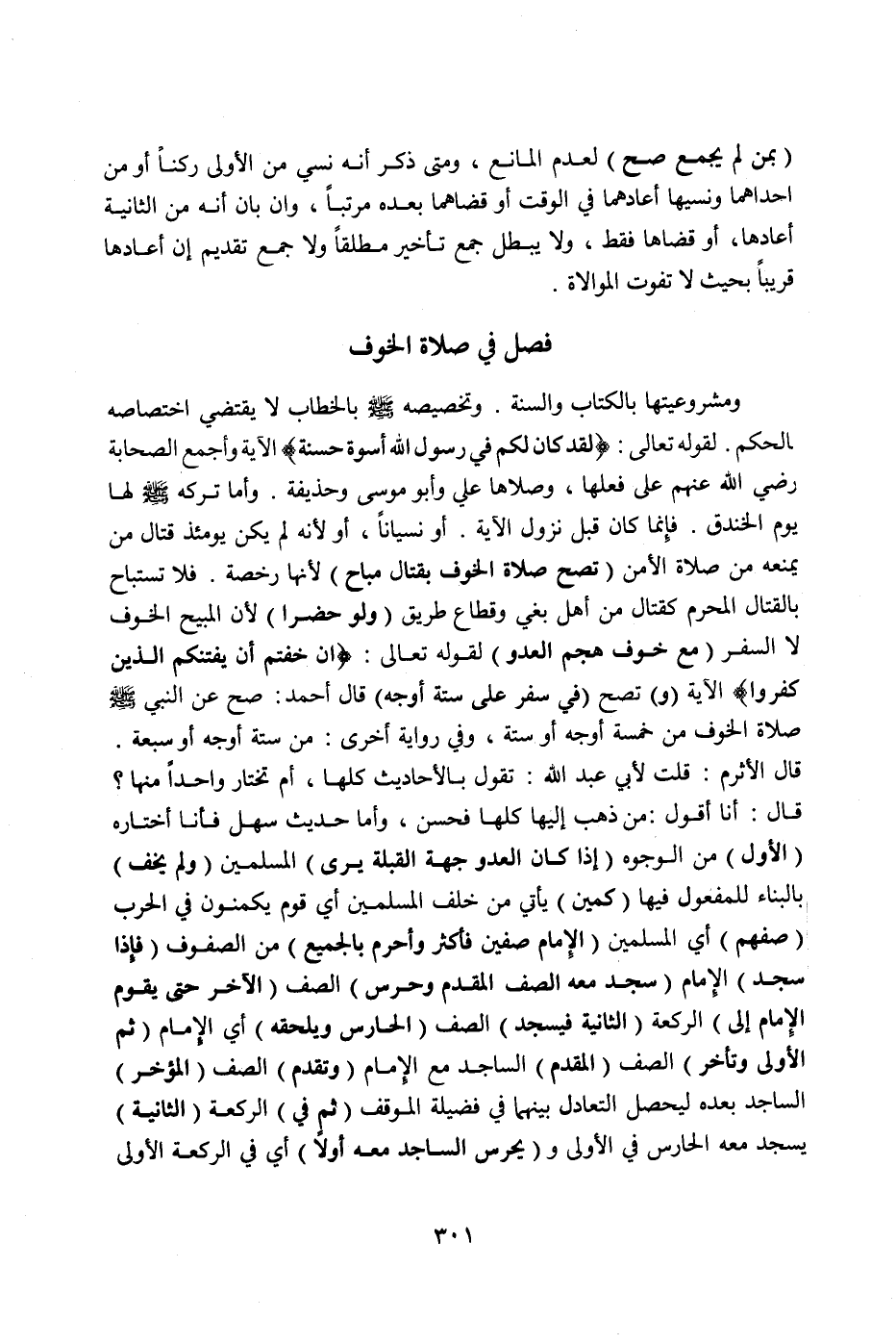 ِ وَمَشْرُوعِيَّتِهَا بِالْكِتَابِ وَالسُّنَّةِ وَتَخْصِيصُهُ صَلَّى اللَّهُ عَلَيْهِ وَسَلَّمَ بِالْخِطَابِ لَا يَقْتَضِي اخْتِصَاصَهُ بِالْحُكْمِ لِقَوْلِهِ تَعَالَى: {لَقَدْ كَانَ لَكُمْ فِي رَسُولِ اللَّهِ أُسْوَةٌ حَسَنَةٌ} [الأحزاب: ٢١] الْآيَةَ وَأَجْمَعَ الصَّحَابَةُ رَضِيَ اللَّهُ عَنْهُمْ عَلَى فِعْلِهَا، وَصَلَّاهَا عَلِيٌّ وَأَبُو مُوسَى وَحُذَيْفَةُ وَأَمَّا تَرْكُهُ صَلَّى اللَّهُ عَلَيْهِ وَسَلَّمَ لَهَا يَوْمَ الْخَنْدَقِ فَإِنَّمَا كَانَ قَبْلَ نُزُولِ الْآيَةِ أَوْ نِسْيَانًا، أَوْ لِأَنَّهُ لَمْ يَكُنْ يَوْمَئِذٍ قِتَالُ مَنْ يَمْنَعُهُ مِنْ صَلَاةِ الْأَمْنِ (تَصِحُّ صَلَاةُ الْخَوْفِ بِقِتَالٍ مُبَاحٍ) لِأَنَّهَا رُخْصَةٌ.