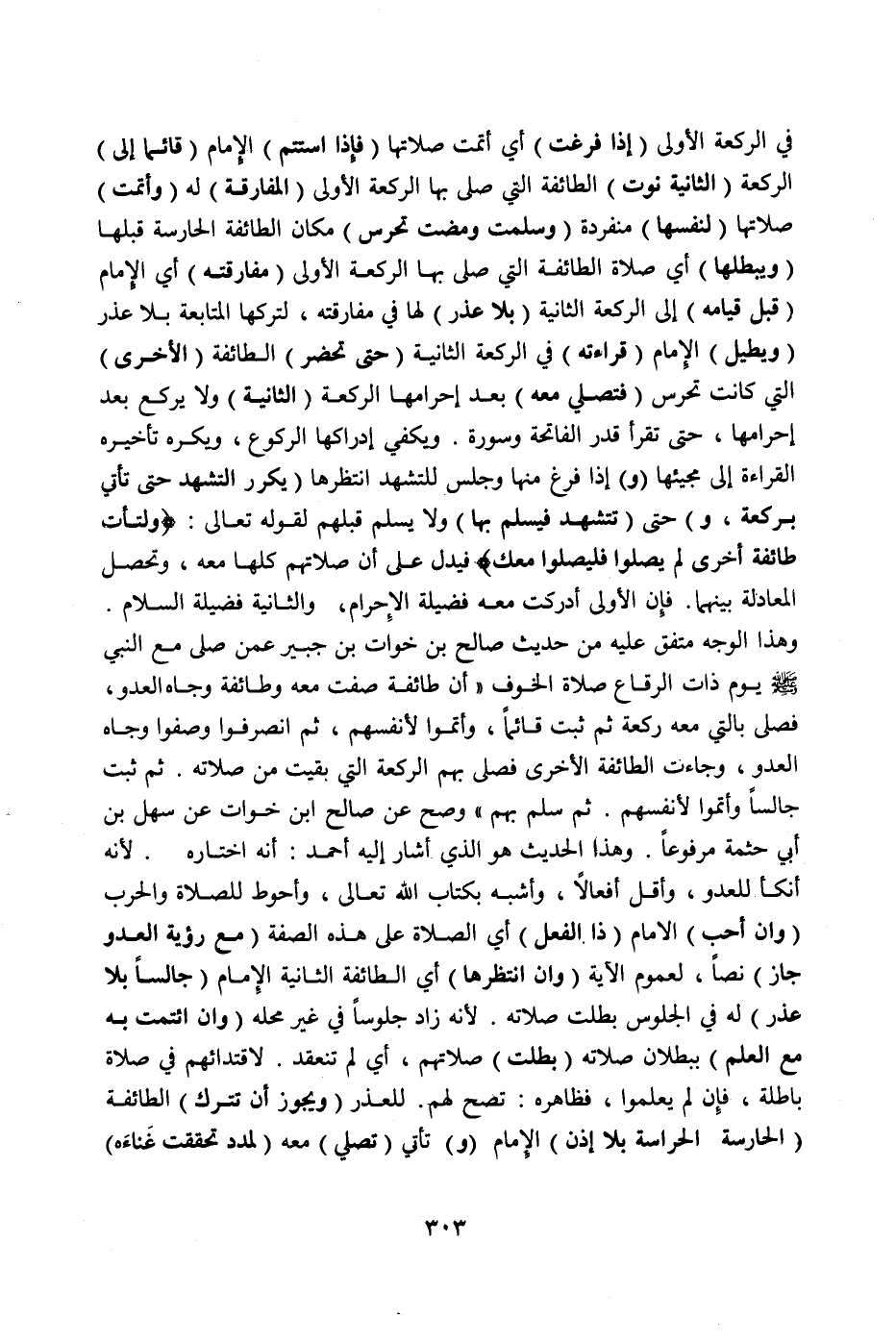 (فَإِذَا اسْتَتَمَّ) الْإِمَامُ (قَائِمًا إلَى) الرَّكْعَةِ (الثَّانِيَةِ نَوَتْ) الطَّائِفَةُ الَّتِي صَلَّى بِهَا الرَّكْعَةَ الْأُولَى (الْمُفَارَقَةَ) لَهُ (وَأَتَمَّتْ) صَلَاتَهَا (لِنَفْسِهَا) مُنْفَرِدَةً (وَسَلَّمَتْ وَمَضَتْ تَحْرُسُ) مَكَانَ الطَّائِفَةِ الْحَارِسَةِ قَبْلَهَا (وَيُبْطِلُهَا) أَيْ صَلَاةَ الطَّائِفَةِ الَّتِي صَلَّى بِهَا الرَّكْعَةَ الْأُولَى (مُفَارَقَتُهُ) أَيْ الْإِمَامِ (قَبْلَ قِيَامِهِ) إلَى الرَّكْعَةِ الثَّانِيَةِ (بِلَا عُذْرٍ) لَهَا فِي مُفَارَقَتِهِ، لِتَرْكِهَا الْمُتَابَعَةَ بِلَا عُذْرٍ (وَيُطِيلُ) الْإِمَامُ (قِرَاءَتَهُ) فِي الرَّكْعَةِ الثَّانِيَةِ (حَتَّى تَحْضُرَ) الطَّائِفَةُ (الْأُخْرَى) الَّتِي كَانَتْ تَحْرُسُ (فَتُصَلِّيَ مَعَهُ) بَعْدَ إحْرَامِهَا الرَّكْعَةَ (الثَّانِيَةَ) وَلَا يَرْكَعُ بَعْدَ إحْرَامِهَا، حَتَّى تَقْرَأَ قَدْرَ الْفَاتِحَةِ وَسُورَةٍ،