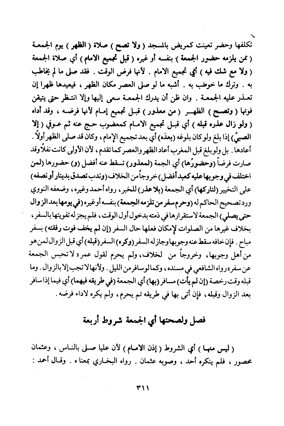 فَصْلٌ وَلِصِحَّتِهَا أَيْ الْجُمُعَةِ شُرُوطٌ أَرْبَعَةٌ (لَيْسَ مِنْهَا) أَيْ الشُّرُوطِ (إذْنُ الْإِمَامِ) لِأَنَّ عَلِيًّا صَلَّى بِالنَّاسِ، وَعُثْمَانُ مَحْصُورٌ، فَلَمْ يُنْكِرْهُ أَحَدٌ، وَصَوَّبَهُ عُثْمَانُ رَوَاهُ الْبُخَارِيُّ بِمَعْنَاهُ وَقَالَ أَحْمَدُ: