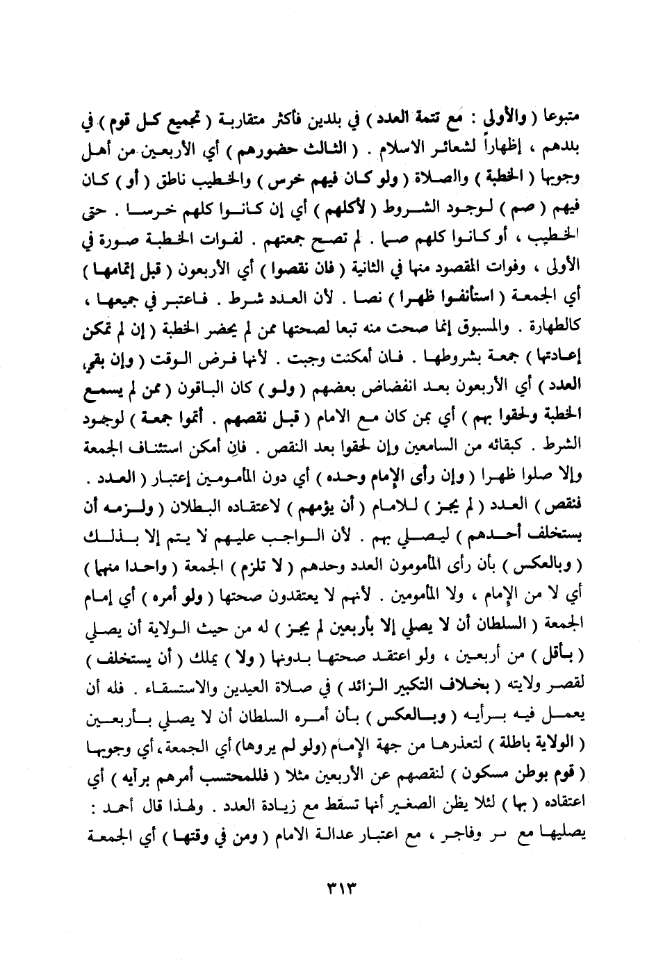 (وَلَوْ أَمَرَهُ) أَيْ إمَامَ الْجُمُعَةِ (السُّلْطَانَ أَنْ لَا يُصَلِّيَ إلَّا بِأَرْبَعِينَ لَمْ يَجُزْ) لَهُ مِنْ حَيْثُ الْوِلَايَةُ أَنْ يُصَلِّيَ (بِأَقَلَّ) مِنْ أَرْبَعِينَ، وَلَوْ اعْتَقَدَ صِحَّتَهَا بِدُونِهَا (وَلَا) يَمْلِكُ (أَنْ يَسْتَخْلِفَ) لِقِصَرِ وِلَايَتِهِ (بِخِلَافِ التَّكْبِيرِ الزَّائِدِ) فِي صَلَاةِ الْعِيدَيْنِ وَالِاسْتِسْقَاءِ، فَلَهُ أَنْ يَعْمَلَ فِيهِ بِرَأْيِهِ (وَبِالْعَكْسِ) بِأَنْ أَمَرَهُ السُّلْطَانُ أَنْ لَا يُصَلِّيَ بِأَرْبَعِينَ (الْوِلَايَةُ بَاطِلَةٌ) لِتَعَذُّرِهَا مِنْ جِهَةِ الْإِمَامِ (وَلَوْ لَمْ يَرَوْهَا) أَيْ الْجُمُعَةَ، أَيْ وُجُوبَهَا (قَوْمٌ بِوَطَنٍ مَسْكُونٍ) لِنَقْصِهِمْ عَنْ الْأَرْبَعِينَ مَثَلًا (فَلِلْمُحْتَسَبِ أَمْرُهُمْ بِرَأْيِهِ) أَيْ اعْتِقَادِهِ (بِهَا) لِئَلَّا يَظُنَّ الصَّغِيرُ أَنَّهَا تَسْقُطُ مَعَ زِيَادَةِ الْعَدَدِ،