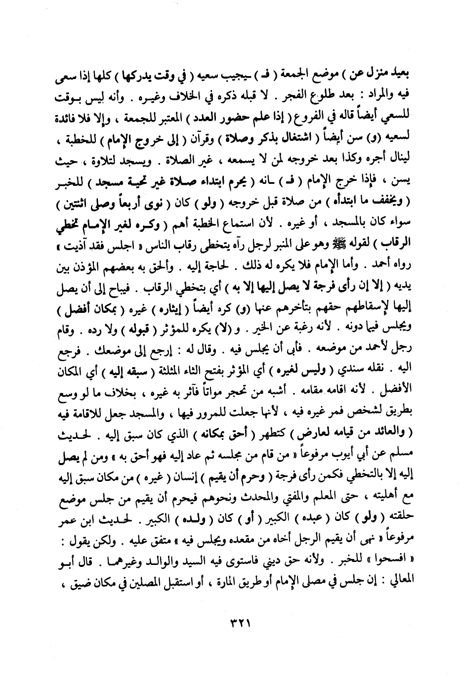 (وَ) سُنَّ أَيْضًا (اشْتِغَالٌ بِذِكْرٍ وَصَلَاةٍ) وَقُرْآنٍ (إلَى خُرُوجِ الْإِمَامِ) لِلْخُطْبَةِ، لِيَنَالَ أَجْرَهُ وَكَذَا بَعْدَ خُرُوجِهِ لِمَنْ لَا يَسْمَعُهُ، غَيْرَ الصَّلَاةِ، وَيَسْجُدُ لِتِلَاوَةٍ حَيْثُ يُسَنُّ فَإِذَا خَرَجَ الْإِمَامُ (فَ) إنَّهُ (يَحْرُمُ ابْتِدَاءُ صَلَاةٍ غَيْرِ تَحِيَّةِ مَسْجِدٍ) لِلْخَبَرِ (وَيُخَفِّفُ مَا ابْتَدَأَهُ) مِنْ صَلَاةٍ قَبْلَ خُرُوجِهِ (وَلَوْ) كَانَ (نَوَى أَرْبَعًا وَصَلَّى اثْنَتَيْنِ) سَوَاءٌ كَانَ بِالْمَسْجِدِ، أَوْ غَيْرِهِ لِأَنَّ اسْتِمَاعَ الْخُطْبَةِ أَهَمُّ (وَكُرِهَ لِغَيْرِ الْإِمَامِ تَخَطِّي الرِّقَابِ) «لِقَوْلِهِ صَلَّى اللَّهُ عَلَيْهِ وَسَلَّمَ وَهُوَ عَلَى الْمِنْبَرِ لِرَجُلٍ رَآهُ يَتَخَطَّى رِقَابَ النَّاسِ اجْلِسْ فَقَدْ آذَيْت» رَوَاهُ أَحْمَدُ.