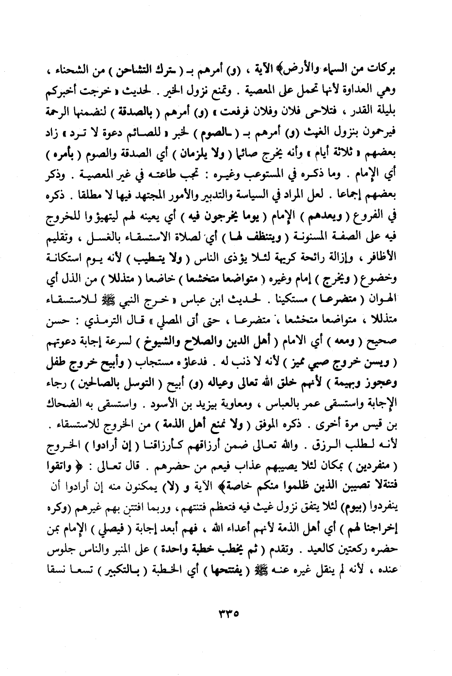 الْآيَةَ، (وَ) أَمَرَهُمْ ب (تَرْكِ التَّشَاحُنِ) مِنْ الشَّحْنَاءِ، وَهِيَ الْعَدَاوَةُ لِأَنَّهَا تَحْمِلُ عَلَى الْمَعْصِيَةِ، وَتَمْنَعُ نُزُولَ الْخَيْرِ لِحَدِيثِ " «خَرَجْت أُخْبِرُكُمْ بِلَيْلَةِ الْقَدْرِ، فَتَلَاحَى فُلَانٌ وَفُلَانٌ فَرُفِعَتْ» " (وَ) أَمَرَهُمْ (بِالصَّدَقَةِ) لِتَضَمُّنِهَا الرَّحْمَة فَيُرْحَمُونَ بِنُزُولِ الْغَيْثِ (وَ) أَمَرَهُمْ ب (الصَّوْمِ) لِخَبَرِ " «لِلصَّائِمِ دَعْوَةٌ لَا تُرَدُّ» " زَادَ بَعْضُهُمْ " ثَلَاثَةَ أَيَّامٍ " وَأَنَّهُ يَخْرُجُ صَائِمًا (وَلَا يَلْزَمَانِ) أَيْ الصَّدَقَةُ وَالصَّوْمُ (بِأَمْرِهِ) أَيْ الْإِمَامِ وَمَا ذَكَرَهُ فِي الْمُسْتَوْعِبِ وَغَيْرِهِ: تَجِبُ طَاعَتُهُ فِي غَيْرِ الْمَعْصِيَةِ وَذَكَرَ بَعْضُهُمْ إجْمَاعًا.