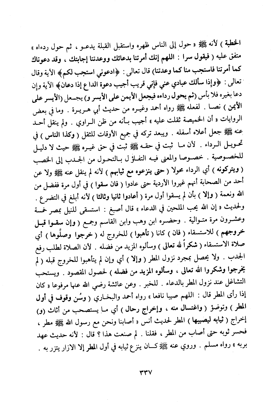 وَمَا فِي بَعْضِ الرِّوَايَاتِ " أَنَّ الْخَمِيصَةَ ثَقُلَتْ عَلَيْهِ " أُجِيبَ بِأَنَّهُ مِنْ ظَنِّ الرَّاوِي وَلَمْ يَنْقُلْ أَحَدٌ عَنْهُ صَلَّى اللَّهُ عَلَيْهِ وَسَلَّمَ جَعْلَ أَعْلَاهُ أَسْفَلَهُ. وَيَبْعُدُ تَرْكُهُ فِي جَمِيعِ الْأَوْقَاتِ لِلثِّقَلِ (وَكَذَا النَّاسُ) فِي تَحْوِيلِ الرِّدَاءِ لِأَنَّ مَا ثَبَتَ فِي حَقِّهِ صَلَّى اللَّهُ عَلَيْهِ وَسَلَّمَ ثَبَتَ فِي حَقِّ غَيْرِهِ صَلَّى اللَّهُ عَلَيْهِ وَسَلَّمَ حَيْثُ لَا دَلِيلَ لِلْخُصُوصِيَّةِ، خُصُوصًا وَالْمَعْنَى فِيهِ التَّفَاؤُلُ بِالتَّحَوُّلِ مِنْ الْجَدْبِ إلَى الْخِصْبِ (وَيَتْرُكُونَهُ) أَيْ الرِّدَاءَ مُحَوَّلًا (حَتَّى يَنْزِعُوهُ مَعَ ثِيَابِهِمْ) لِأَنَّهُ لَمْ يُنْقَلْ عَنْهُ صَلَّى اللَّهُ عَلَيْهِ وَسَلَّمَ وَلَا عَنْ أَحَدٍ مِنْ الصَّحَابَةِ أَنَّهُمْ غَيَّرُوا الْأَرْدِيَةَ حَتَّى عَادُوا (فَإِنْ سُقُوا) فِي أَوَّلِ مَرَّةٍ فَفَضْلٌ مِنْ اللَّهِ وَنِعْمَةٌ (وَإِلَّا) بِأَنْ لَمْ يُسْقَوْا أَوَّلَ مَرَّةٍ (أَعَادُوا ثَانِيًا وَثَالِثًا) لِأَنَّهُ أَبْلَغُ فِي التَّضَرُّعِ.