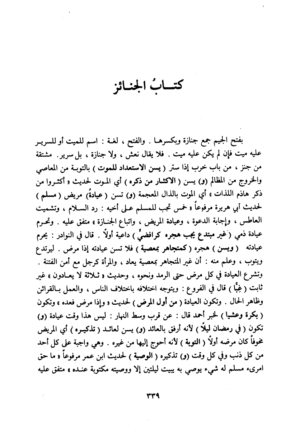 ِ بِفَتْحِ الْجِيمِ جَمْعُ جِنَازَةٍ وَبِكَسْرِهَا. وَالْفَتْحُ لُغَةً: اسْمٌ لِلْمَيِّتِ أَوْ لِلسَّرِيرِ عَلَيْهِ مَيِّتٌ فَإِنْ لَمْ يَكُنْ عَلَيْهِ مَيِّتٌ، فَلَا يُقَالُ نَعْشٌ، وَلَا جِنَازَةٌ، بَلْ سَرِيرٌ مُشْتَقَّةٌ مِنْ جَنِزَ، مِنْ بَابِ خَرِبَ إذَا سَتَرَ (يُسَنُّ الِاسْتِعْدَادُ لِلْمَوْتِ) بِالتَّوْبَةِ مِنْ الْمَعَاصِي وَالْخُرُوجِ مِنْ الْمَظَالِمِ (وَ) يُسَنُّ (الْإِكْثَارُ مِنْ ذِكْرِهِ) أَيْ الْمَوْتِ لِحَدِيثِ " «أَكْثِرُوا مِنْ ذِكْرِ هَادِمِ اللَّذَّاتِ» " أَيْ الْمَوْتِ بِالذَّالِ الْمُعْجَمَةِ.