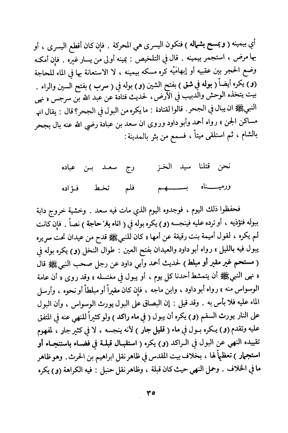وَرُوِيَ أَنَّ سَعْدَ بْنَ عُبَادَةَ رَضِيَ اللَّهُ عَنْهُ بَال بِجُحْرٍ بِالشَّامِ، ثُمَّ اسْتَلْقَى مَيِّتًا، فَسُمِعَ مِنْ بِئْرٍ بِالْمَدِينَةِ: