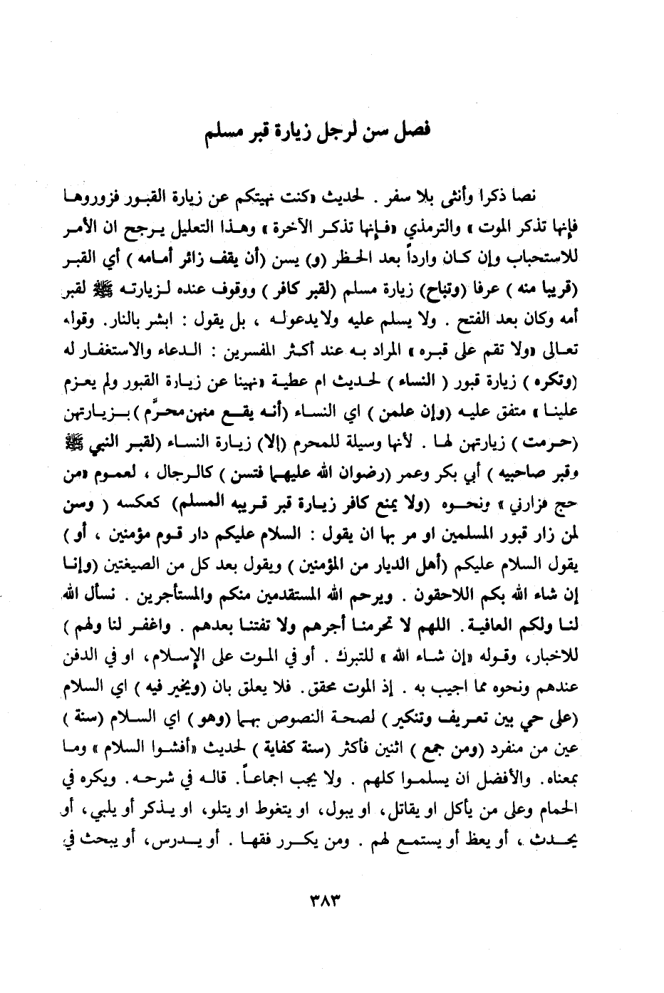 سُنَّ لِرَجُلٍ زِيَارَةُ قَبْرِ مُسْلِمٍ نَصًّا ذَكَرًا وَأُنْثَى بِلَا سَفَرٍ لِحَدِيثِ «كُنْت نَهَيْتُكُمْ عَنْ زِيَارَةِ الْقُبُورِ فَزُورُوهَا فَإِنَّهَا تُذَكِّرُ الْمَوْتَ» وَالتِّرْمِذِيِّ " فَإِنَّهَا تُذَكِّرُ الْآخِرَةَ " وَهَذَا التَّعْلِيلُ يُرَجِّحُ أَنَّ الْأَمْرَ لِلِاسْتِحْبَابِ إنْ كَانَ وَارِدًا بَعْدَ الْحَظْرِ.