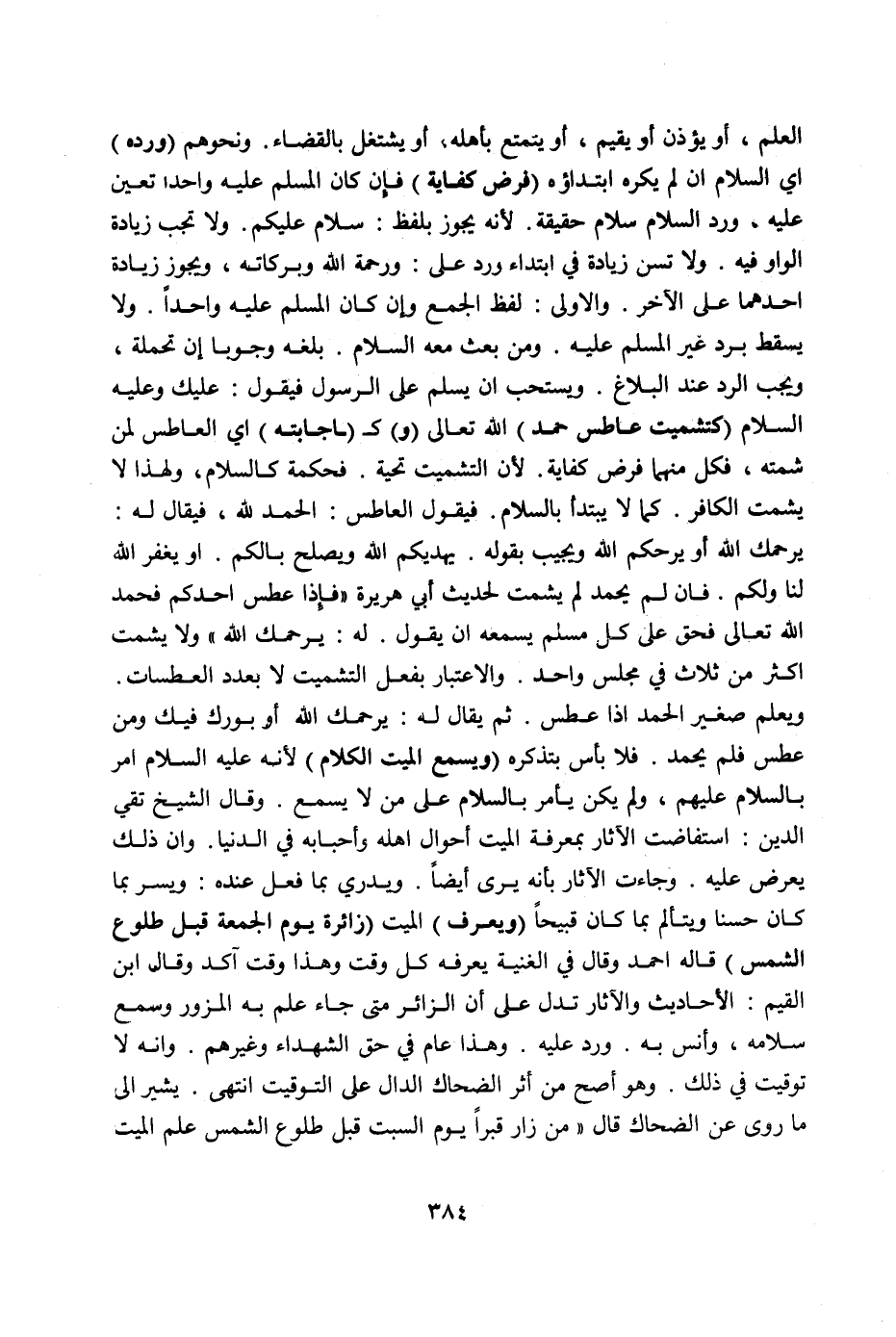 الْعِلْمِ، أَوْ يُؤَذِّنُ أَوْ يُقِيمُ، أَوْ يَتَمَتَّعُ بِأَهْلِهِ، أَوْ يَشْتَغِلُ بِالْقَضَاءِ وَنَحْوُهُمْ (وَرَدُّهُ) أَيْ السَّلَامِ إنْ لَمْ يُكْرَهْ ابْتِدَاؤُهُ (فَرْضُ كِفَايَةٍ) فَإِنْ كَانَ الْمُسَلَّمُ عَلَيْهِ وَاحِدًا تَعَيَّنَ عَلَيْهِ، وَرَدُّ السَّلَامِ سَلَامٌ حَقِيقَةً لِأَنَّهُ يَجُوزُ بِلَفْظِ: سَلَامٌ عَلَيْكُمْ،