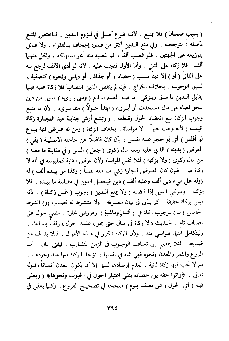 وَفِي مَنْعِ الدَّيْنِ أَكْثَرَ مِنْ قَدْرِهِ إجْحَافٌ بِالْفُقَرَاءِ وَلَا قَائِلَ بِتَوْزِيعِهِ عَلَى الْجِهَتَيْنِ فَلَوْ غَصَبَ أَلْفًا، ثُمَّ غَصَبَهُ مِنْهُ آخَرُ اسْتَهْلَكَهُ، وَلِكُلٍّ مِنْهُمَا أَلْفٌ فَلَا زَكَاةَ عَلَى الثَّانِي وَأَمَّا الْأَوَّلُ فَتَجِبُ عَلَيْهِ لِأَنَّهُ لَوْ أَدَّى الْأَلْفَ لَرَجَعَ بِهِ عَلَى الثَّانِي (أَوْ) إلَّا دَيْنًا بِسَبَبِ (حَصَادٍ، أَوْ جِذَاذٍ، أَوْ دِيَاسٍ وَنَحْوِهِ) كَتَصْفِيَةٍ، لِسَبْقِ الْوُجُوبِ بِخِلَافِ الْخَرَاجِ، فَإِنْ لَمْ يُنْقِصْ الدَّيْنُ النِّصَابَ فَلَا زَكَاةَ عَلَيْهِ فِيمَا يُقَابِلُ الدَّيْنَ لِمَا سَبَقَ وَيُزَكِّي مَا فِيهِ لِعَدَمِ الْمَانِعِ (وَمَتَى بَرِئَ) مَدِينٌ مِنْ دَيْنٍ بِنَحْوِ قَضَاءٍ مِنْ مَالٍ مُسْتَحْدَثٍ أَوْ أُبْرِئَ (ابْتَدَأَ حَوْلًا) مُنْذُ بَرِئَ لِأَنَّ مَا مَنَعَ وُجُوبَ الزَّكَاةِ مَنَعَ انْعِقَادَ الْحَوْلِ وَقَطَعَهُ.