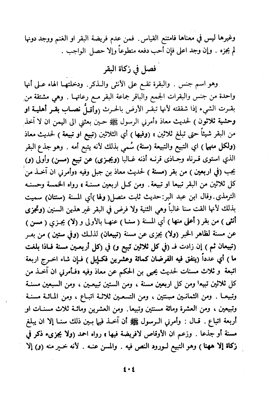 فِي زَكَاةِ الْبَقَرِ وَهُوَ اسْمُ جِنْسٍ، وَالْبَقَرَةُ تَقَعُ عَلَى الْأُنْثَى وَالذَّكَرِ، وَدَخَلَتْهَا الْهَاءُ عَلَى أَنَّهَا وَاحِدَةٌ مِنْ جِنْسٍ وَالْبَقَرَاتُ الْجَمْعُ وَالْبَاقِرُ جَمَاعَةُ الْبَقَرِ مَعَ رُعَاتِهَا، وَهِيَ مُشْتَقَّةٌ مِنْ بَقَرْت الشَّيْءَ إذَا شَقَقْته لِأَنَّهَا تَبْقُرُ الْأَرْضَ بِالْحَرْثِ (وَأَقَلُّ نِصَابِ بَقَرٍ أَهْلِيَّةٍ أَوْ وَحْشِيَّةٍ ثَلَاثُونَ) «لِحَدِيثِ مُعَاذٍ أَمَرَنِي الرَّسُولُ صَلَّى اللَّهُ عَلَيْهِ وَسَلَّمَ حِينَ بَعَثَنِي إلَى الْيَمَنِ أَنْ لَا آخُذَ مِنْ الْبَقَرِ شَيْئًا حَتَّى تَبْلُغَ ثَلَاثِينَ» " (وَفِيهَا) أَيْ: الثَّلَاثِينَ (تَبِيعٌ أَوْ تَبِيعَةٌ) لِحَدِيثِ مُعَاذٍ (وَلِكُلٍّ مِنْهُمَا) أَيْ: التَّبِيعِ وَالتَّبِيعَةِ (سَنَةٌ) سُمِّيَ بِذَلِكَ لِأَنَّهُ يَتْبَعُ أُمَّهُ، وَهُوَ جَذَعُ الْبَقَرِ الَّذِي اسْتَوَى قَرْنَاهُ وَحَاذَى قَرْنُهُ أُذُنَهُ غَالِبًا (وَيُجْزِي) عَنْ تَبِيعٍ (مُسِنٌّ) وَأَوْلَى.