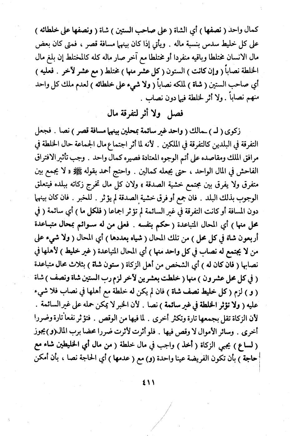 فَصْلٌ وَلَا أَثَرَ لِتَفْرِقَةِ مَالٍ زَكَوِيٍّ (لِ) مَالِكٍ (وَاحِدٍ غَيْرَ سَائِمَةٍ بِمَحَلَّيْنِ بَيْنَهُمَا مَسَافَةُ قَصْرٍ) نَصًّا فَجَعَلَ التَّفْرِقَةَ فِي الْبَلَدَيْنِ كَالتَّفْرِقَةِ فِي الْمِلْكَيْنِ ; لِأَنَّهُ لَمَّا أَثَّرَ اجْتِمَاعُ مَالِ الْجَمَاعَةِ حَالَ الْخُلْطَةِ فِي مَرَافِقِ الْمِلْكِ وَمَقَاصِدِهِ عَلَى أَتَمِّ الْوُجُوهِ الْمُعْتَادَةِ فَصَيَّرَهُ كَمَالٍ وَاحِدٍ وَجَبَ تَأْثِيرُ الِافْتِرَاقِ الْفَاحِشِ فِي الْمَالِ الْوَاحِدِ، حَتَّى يَجْعَلَهُ كَمَالَيْنِ. وَاحْتَجَّ أَحْمَدُ بِقَوْلِهِ صَلَّى اللَّهُ عَلَيْهِ وَسَلَّمَ «لَا يُجْمَعُ بَيْنَ مُتَفَرِّقٍ وَلَا يُفَرَّقُ بَيْنَ مُجْتَمِعٍ خَشْيَةَ الصَّدَقَةِ» وَلِأَنَّ كُلَّ مَالٍ تَخْرُجُ زَكَاتُهُ بِبَلَدِهِ فَيَتَعَلَّقُ الْوُجُوبُ بِذَلِكَ الْبَلَد، فَإِنْ جُمِعَ أَوْ فُرِّقَ خَشْيَةَ الصَّدَقَةِ لَمْ يُؤَثِّرْ لِلْخَبَرِ، فَإِنْ كَانَ بَيْنَهُمَا دُونَ الْمَسَافَةِ أَوْ كَانَتْ التَّفْرِقَةُ فِي غَيْرِ السَّائِمَةِ لَمْ تُؤَثِّرْ إجْمَاعًا (فَلِكُلِّ مَا) أَيْ سَائِمَةٍ (فِي مَحَلٍّ مِنْهَا) أَيْ: الْمَحَالِّ الْمُتَبَاعِدَةِ (حُكْمٌ بِنَفْسِهِ فَعَلَى مَنْ لَهُ سَوَائِمُ بِمَحَالَّ مُتَبَاعِدَةٍ أَرْبَعُونَ شَاةً فِي كُلِّ مَحَلٍّ) مِنْ تِلْكَ الْمَحَالِّ (شِيَاهٌ بِعَدَدِهَا) أَيْ الْمَحَالِّ (وَلَا شَيْءَ عَلَى مَنْ لَا يَجْتَمِعُ لَهُ نِصَابٌ فِي كُلِّ وَاحِدٍ مِنْهَا) أَيْ: الْمَحَالِّ الْمُتَبَاعِدَةِ (غَيْرُ خَلِيطٍ) لِأَهْلِهَا فِي نِصَابِهَا (فَإِنْ كَانَ لَهُ) أَيْ الشَّخْصِ مِنْ أَهْلِ الزَّكَاةِ (سِتُّونَ شَاةً) بِثَلَاثِ مَحَالَّ مُتَبَاعِدَةٍ (فِي كُلِّ مَحَلٍّ عِشْرُونَ) مِنْهَا (خُلِطَتْ بِعِشْرِينَ لِآخَرَ لَزِمَ رَبَّ السِّتِّينَ شَاةٌ وَنِصْفُ) شَاةٍ.