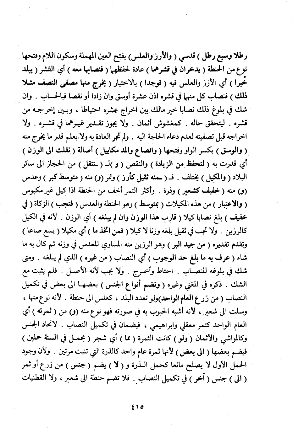 رِطْلًا وَسُبْعُ رِطْلٍ) قُدْسِيٍّ (وَالْأُرْزُ وَالْعَلْسُ) بِفَتْحِ الْعَيْنِ الْمُهْمَلَةِ وَسُكُونِ اللَّامِ وَفَتْحِهَا نَوْعٌ مِنْ الْحِنْطَةِ (يُدَّخَرَانِ فِي قِشْرِهِمَا) عَادَةً لِحِفْظِهِمَا (فَنِصَابُهَا مَعَهُ) أَيْ: الْقِشْرِ (بِبَلَدٍ خُبِرَا) أَيْ: الْأُرْزُ وَالْعَلْسُ فِيهِ (فَوُجِدَا) بِالِاخْتِبَارِ (يَخْرُجُ مِنْهَا مُصَفَّى النِّصْفِ مَثَلًا ذَلِكَ) فَنِصَابُ كُلٍّ مِنْهُمَا فِي قِشْرِهِ إذَنْ عَشْرَةُ أَوْسُقٍ وَإِنْ زَادَا أَوْ نَقَصَا فَبِالْحِسَابِ، وَإِنْ شَكَّ فِي بُلُوغِ ذَلِكَ نِصَابًا خَيَّرَ مَالِكٌ بَيْنَ إخْرَاجِ عُشْرِهِ احْتِيَاطًا، وَبَيْنَ إخْرَاجِهِ مِنْ قِشْرِهِ لِيَتَحَقَّقَ حَالُهُ كَمَغْشُوشِ أَثْمَانٍ، وَلَا يَجُوزُ تَقْدِيرُ غَيْرِهِمَا فِي قِشْرِهِ، وَلَا إخْرَاجُهُ قَبْلَ تَصْفِيَتِهِ لِعَدَمِ دُعَاءِ الْحَاجَةِ إلَيْهِ، وَلَمْ تَجْرِ الْعَادَةُ بِهِ وَلَا يُعْلَمُ قَدْرُ مَا يَخْرُجُ مِنْهُ (وَالْوِسْقُ) بِكَسْرِ الْوَاوِ وَفَتْحِهَا (وَالصَّاعُ وَالْمُدُّ مَكَايِيلُ) أَصَالَةً (نُقِلَتْ إلَى الْوَزْنِ) أَيْ: قُدِّرَتْ بِهِ (لِتُحْفَظَ مِنْ الزِّيَادَةِ) وَالنَّقْصِ (وَ) لِ (تُنْقَلَ) مِنْ الْحِجَازِ إلَى سَائِرِ الْبِلَادِ (وَالْمَكِيلُ) يَخْتَلِفُ.