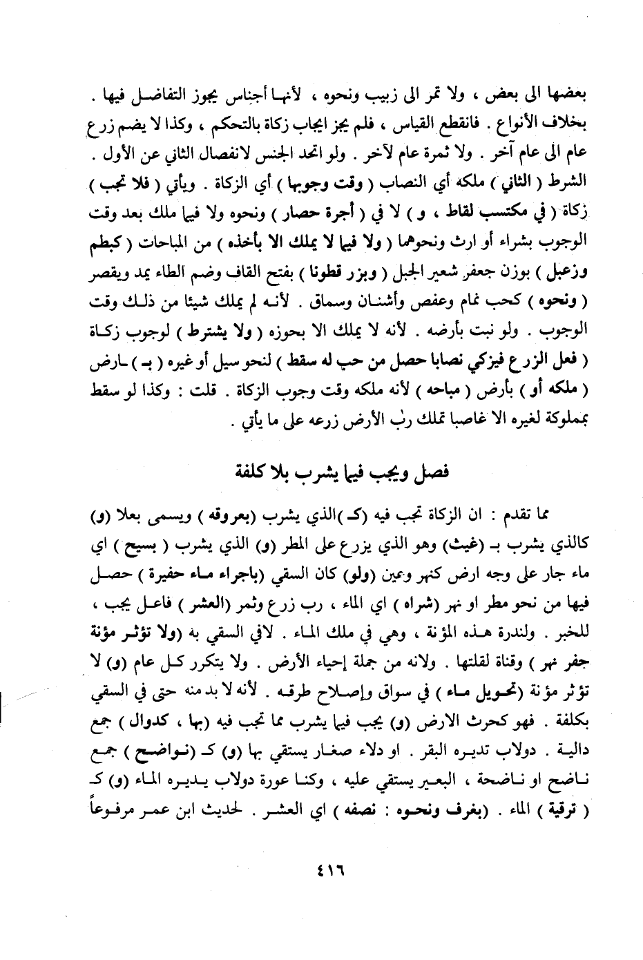 فَصْلٌ وَيَجِبُ فِيمَا يُشْرَبُ بِلَا كُلْفَةٍ مِمَّا تَقَدَّمَ: إنَّ الزَّكَاةَ تَجِبُ فِيهِ (ك) الَّذِي يَشْرَبُ (بِعُرُوقِهِ) وَيُسَمَّى بَعْلًا (وَ) كَاَلَّذِي يَشْرَبُ ب (غَيْثٍ) وَهُوَ الَّذِي يُزْرَعُ عَلَى الْمَطَرِ (وَ) الَّذِي يُشْرَبُ (بِسَيْحٍ) أَيْ: مَاءٍ جَارٍ عَلَى وَجْهِ أَرْضٍ كَنَهْرٍ وَعَيْنٍ (وَلَوْ) كَانَ السَّقْيُ (بِإِجْرَاءِ مَاءِ حَفِيرَةٍ) حَصَلَ فِيهَا مِنْ نَحْوِ مَطَرٍ أَوْ نَهْرٍ (شَرَاهُ) أَيْ: الْمَاءَ، رَبُّ زَرْعٍ وَثَمَرٍ (الْعُشْرُ) فَاعِلُ يَجِبُ، لِلْخَبَرِ وَلِنُدْرَةِ هَذِهِ الْمُؤْنَةِ، وَهِيَ فِي مِلْكِ الْمَاءِ. لَا فِي السَّقْيِ بِهِ (وَلَا تُؤَثِّرُ مُؤْنَةُ حَفْرِ نَهْرٍ) وَقَنَاةٌ لِقِلَّتِهَا، وَلِأَنَّهُ مِنْ جُمْلَةِ إحْيَاءِ الْأَرْضِ، وَلَا يَتَكَرَّرُ كُلَّ عَامٍ (وَ) لَا تُؤَثِّرُ مُؤْنَةُ (تَحْوِيلِ مَاءٍ) فِي سَوَاقٍ وَإِصْلَاحِ طُرُقِهِ ; لِأَنَّهُ لَا بُدَّ مِنْهُ حَتَّى فِي السَّقْيِ بِكُلْفَةٍ، فَهُوَ كَحَرْثِ الْأَرْضِ (و) يَجِبُ فِيمَا يَشْرَبُ مِمَّا تَجِبُ فِيهِ (بِهَا، كَدَوَالٍ) جَمْعُ دَالِيَةٍ دُولَابٌ تُدِيرُهُ الْبَقَرُ، أَوْ دِلَاءٌ صِغَارٌ يَسْتَقِي بِهَا.