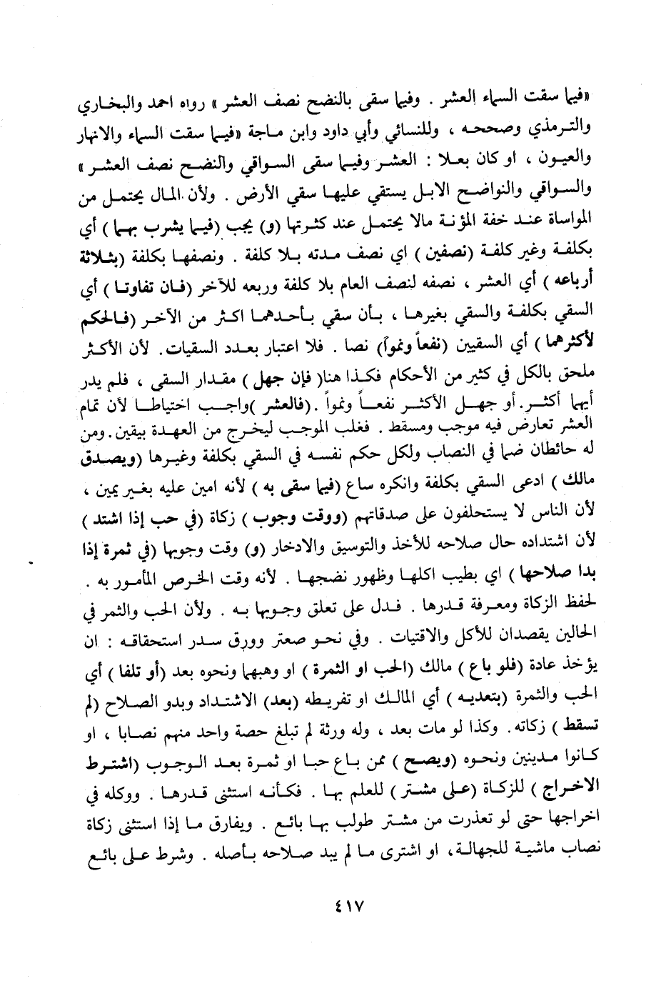 «فِيمَا سَقَتْ السَّمَاءُ الْعُشْرُ وَفِيمَا سُقِيَ بِالنَّضْحِ نِصْفُ الْعُشْرِ» رَوَاهُ أَحْمَدُ وَالْبُخَارِيُّ وَالتِّرْمِذِيُّ وَصَحَّحَهُ وَلِلنَّسَائِيِّ وَأَبِي دَاوُد وَابْنِ مَاجَهْ «فِيمَا سَقَتْ السَّمَاءُ وَالْأَنْهَارُ وَالْعُيُونُ، أَوْ كَانَ بَعْلًا: الْعُشْرُ فِيمَا سَقَى السَّوَاقِي وَالنَّضْحُ نِصْفُ الْعُشْرِ» وَالسَّوَاقِي وَالنَّوَاضِحُ الْإِبِلُ يَسْتَقِي عَلَيْهِمَا سَقْيَ الْأَرْضِ ; وَلِأَنَّ الْمَالَ يَحْتَمِلُ مِنْ الْمُوَاسَاةِ عِنْدَ خِفَّةِ الْمُؤْنَةِ مَا لَا يَحْتَمِلُ عِنْدَ كَثْرَتِهِمَا (وَ) يَجِبُ (فِيمَا يُشْرِبُ بِهِمَا) أَيْ: بِكُلْفَةٍ وَغَيْرِ كُلْفَةٍ (نِصْفَانِ) أَيْ: نِصْفُ مُدَّتِهِ بِلَا كُلْفَةٍ وَنِصْفُهَا بِكُلْفَةٍ (بِثَلَاثَةِ أَرْبَاعِهِ) أَيْ: الْعُشْرِ، وَنِصْفُهُ لِنِصْفِ الْعَامِ بِلَا كُلْفَةٍ وَرُبْعُهُ لِلْآخَرِ (فَإِنْ تَفَاوَتَا) أَيْ: السَّقْيُ بِكُلْفَةٍ وَالسَّقْيُ بِغَيْرِهَا، بِأَنْ سُقِيَ بِأَحَدِهِمَا أَكْثَرَ مِنْ الْآخَرِ (فَالْحُكْمُ لِأَكْثَرِهِمَا) أَيْ: السَّقْيَيْنِ (نَفْعًا وَنُمُوًّا) نَصًّا، فَلَا اعْتِبَارَ بِعَدَدِ السَّقْيَات ; لِأَنَّ الْأَكْثَرَ مُلْحَقٌ بِالْكُلِّ فِي كَثِيرٍ مِنْ الْأَحْكَامِ فَكَذَا هُنَا.