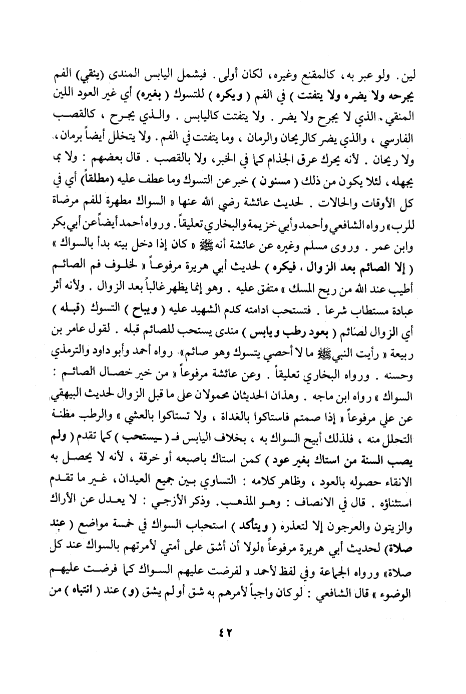 لَيِّنٍ، وَلَوْ عَبَّرَ بِهِ، كَالْمُقْنِعِ وَغَيْرِهِ، لَكَانَ أَوْلَى. فَيَشْمَلُ الْيَابِسَ الْمُنْدِي (يُنْقِي) الْفَمَ (لَا يَجْرَحُهُ وَلَا يَضُرُّهُ وَلَا يَتَفَتَّتُ) فِي الْفَمِ.